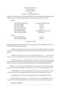 March 30, 1998 admin Comment off File Type: pdf File Size: 31 KB Categories: RESOLUTIONS Author: Hon. Nelly P. Toloso Share: Resolution No. 98-019 Resolution No. 98-021