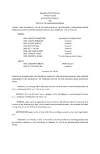 May 25, 1998 admin Comment off File Type: pdf File Size: 30 KB Categories: RESOLUTIONS Author: Hon. Nelly P. Toloso Share: Resolution No. 98-023 Resolution No. 98-026