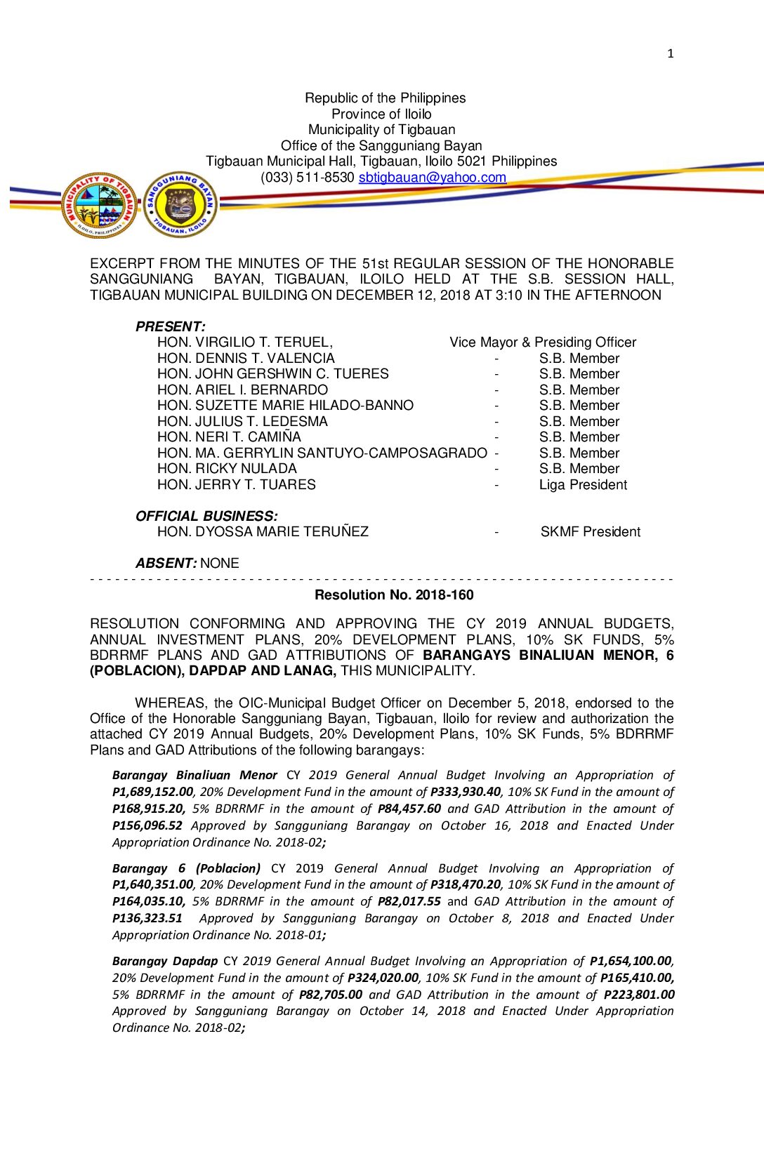 Resolution No. 2018-160 – RESOLUTION CONFORMING AND APPROVING THE CY 2019 ANNUAL BUDGETS, ANNUAL INVESTMENT PLANS, 20% DEVELOPMENT PLANS, 10% SK FUNDS, 5% BDRRMF PLANS AND GAD ATTRIBUTIONS OF BARANGAYS BINALIUAN MENOR, 6 (POBLACION), DAPDAP AND LANAG, THIS MUNICIPALITY.