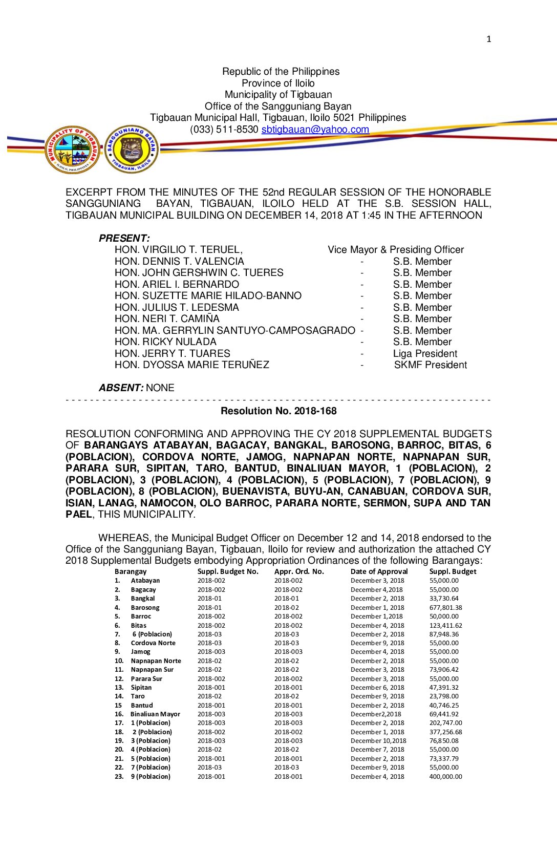 Resolution No. 2018-168 – RESOLUTION CONFORMING AND APPROVING THE CY 2018 SUPPLEMENTAL BUDGETS OF BARANGAYS ATABAYAN, BAGACAY, BANGKAL, BAROSONG, BARROC, BITAS, 6 (POBLACION), CORDOVA NORTE, JAMOG, NAPNAPAN NORTE, NAPNAPAN SUR, PARARA SUR, SIPITAN, TARO, BANTUD, BINALIUAN MAYOR, 1 (POBLACION), 2 (POBLACION), 3 (POBLACION), 4 (POBLACION), 5 (POBLACION), 7 (POBLACION), 9 (POBLACION), 8 (POBLACION), BUENAVISTA, BUYU-AN, CANABUAN, CORDOVA SUR, ISIAN, LANAG, NAMOCON, OLO BARROC, PARARA NORTE, SERMON, SUPA AND TAN PAEL, THIS MUNICIPALITY.