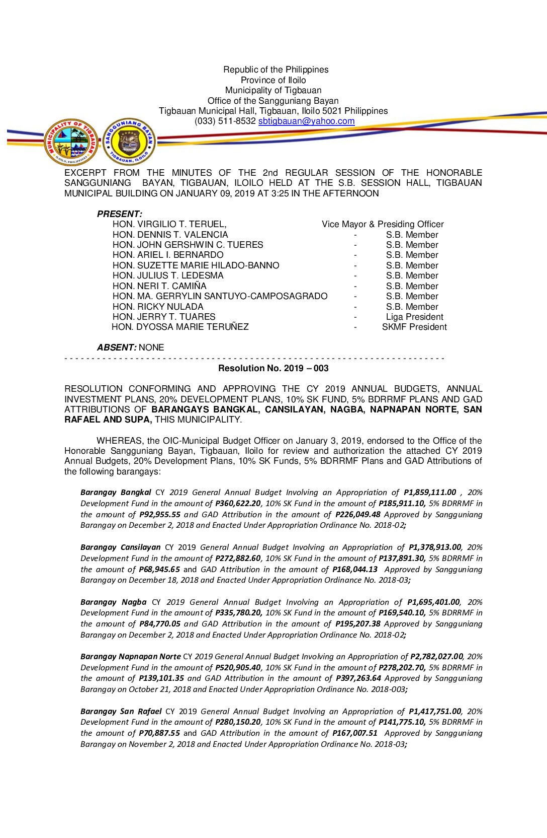 Resolution No. 2019-003 – RESOLUTION CONFORMING AND APPROVING THE CY 2019 ANNUAL BUDGETS, ANNUAL INVESTMENT PLANS, 20% DEVELOPMENT PLANS, 10% SK FUND, 5% BDRRMF PLANS AND GAD ATTRIBUTIONS OF BARANGAYS BANGKAL, CANSILAYAN, NAGBA, NAPNAPAN NORTE, SAN RAFAEL AND SUPA, THIS MUNICIPALITY.