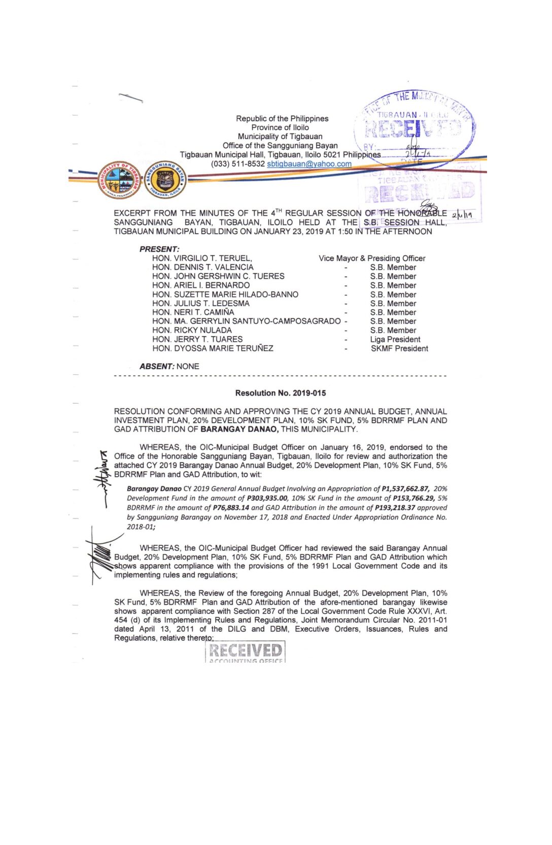 Resolution No. 2019-015 – Resolution Conforming And Approving The CY 2019 Annual Budget, Annual Investment Plan, 20% Development Plan, 10% SK Fund, 5% BDRRMF Plan And GAD Attribution Of Barangay Danao, This Municipality.