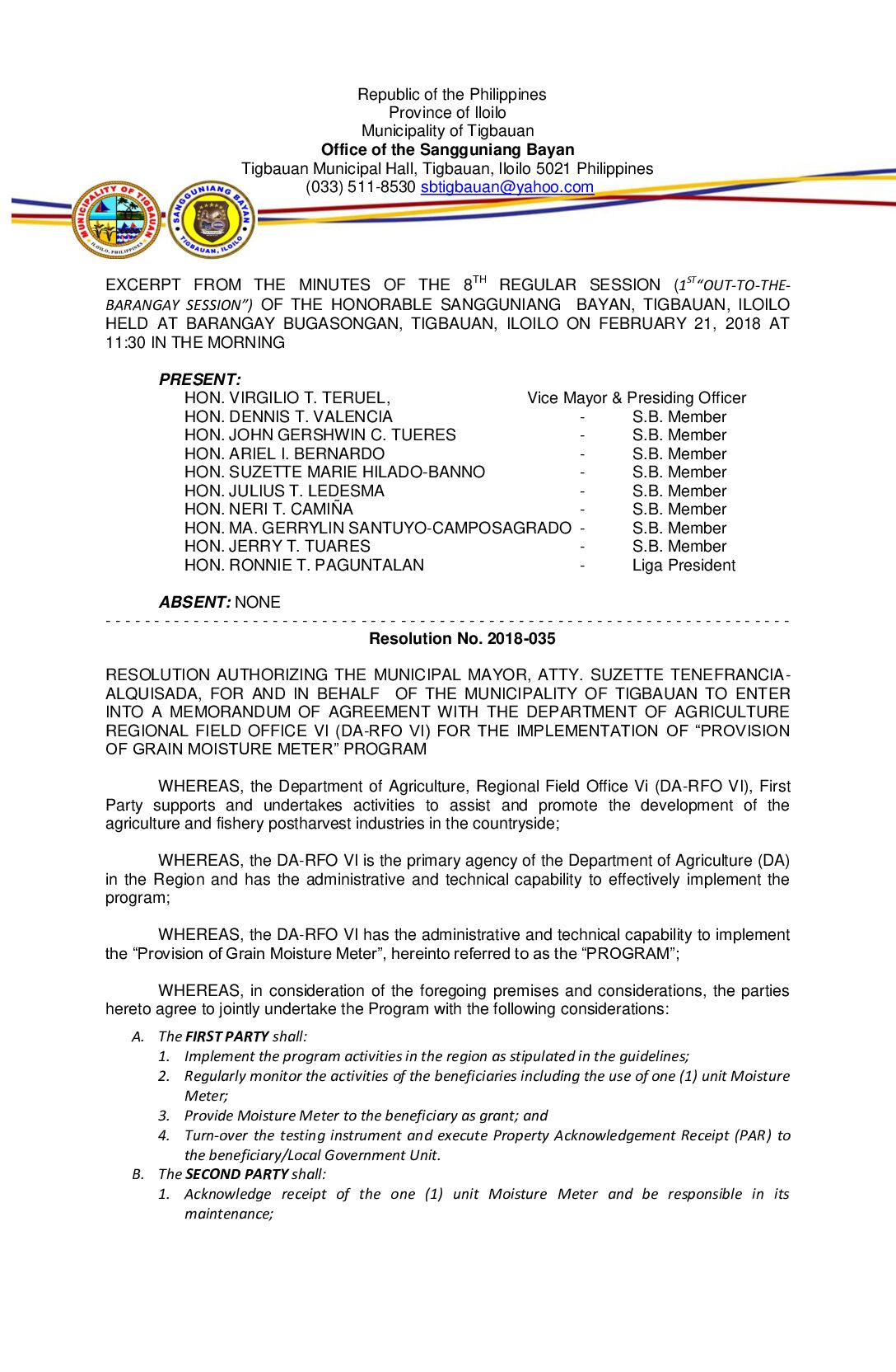 Resolution No. 2018-035 – RESOLUTION AUTHORIZING THE MUNICIPAL MAYOR, ATTY. SUZETTE TENEFRANCIA- ALQUISADA, FOR AND IN BEHALF OF THE MUNICIPALITY OF TIGBAUAN TO ENTER INTO A MEMORANDUM OF AGREEMENT WITH THE DEPARTMENT OF AGRICULTURE REGIONAL FIELD OFFICE VI (DA-RFO VI) FOR THE IMPLEMENTATION OF “PROVISION OF GRAIN MOISTURE METER” PROGRAM
