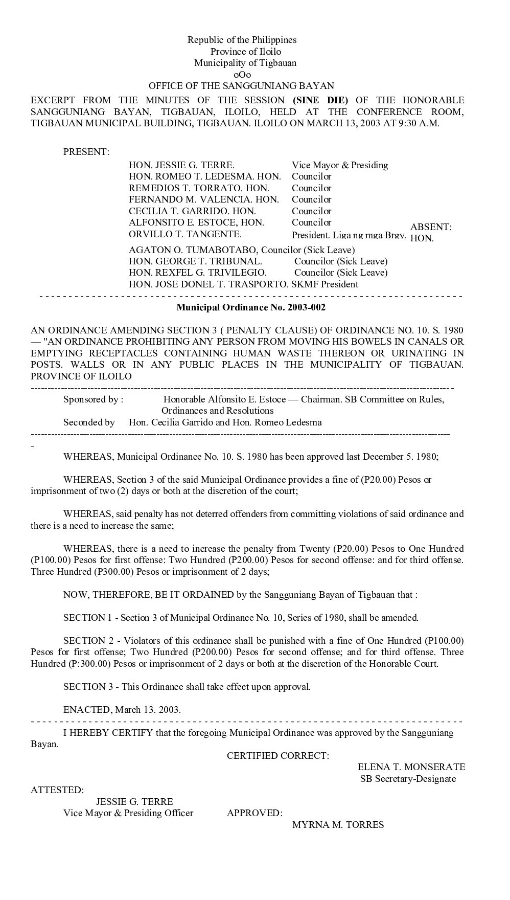 Municipal Ordinance No. 2003-002