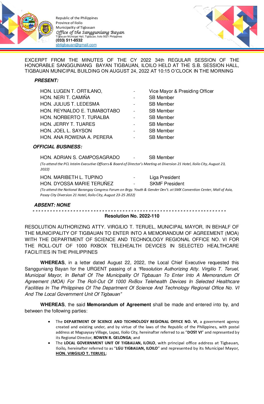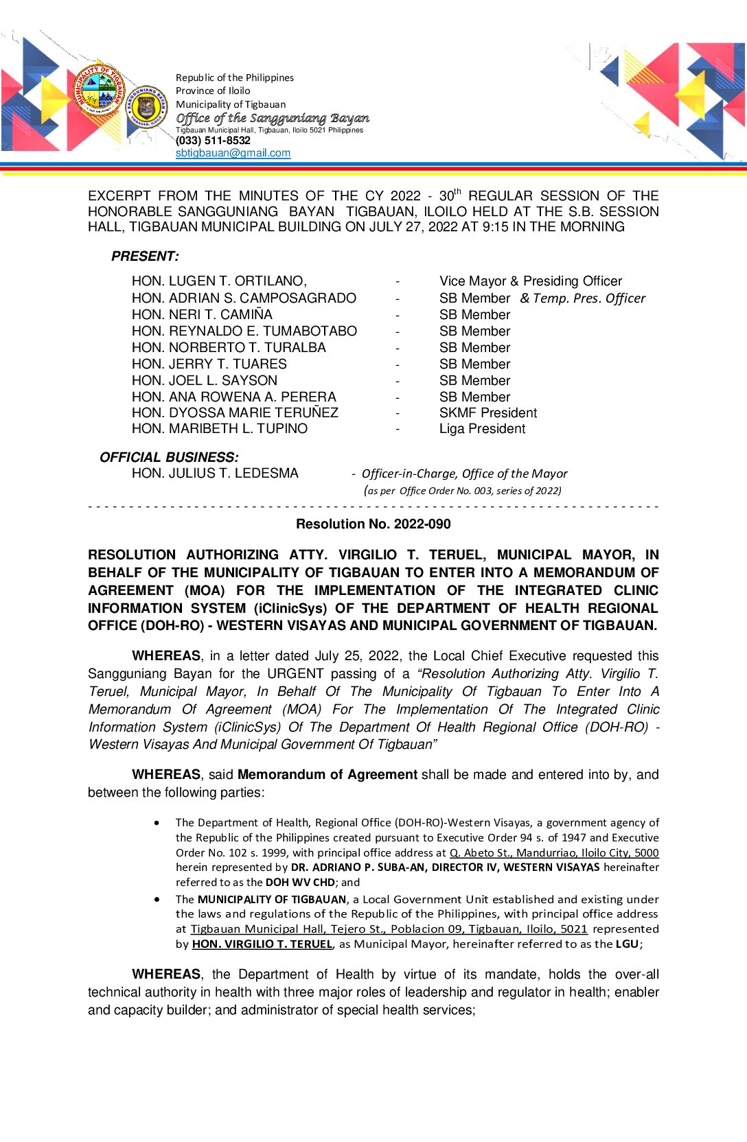 Resolution No. 2022-090 – RESOLUTION AUTHORIZING ATTY. VIRGILIO T. TERUEL, MUNICIPAL MAYOR, IN BEHALF OF THE MUNICIPALITY OF TIGBAUAN TO ENTER INTO A MEMORANDUM OF AGREEMENT (MOA) FOR THE IMPLEMENTATION OF THE INTEGRATED CLINIC INFORMATION SYSTEM (iClinicSys) OF THE DEPARTMENT OF HEALTH REGIONAL OFFICE (DOH-RO) – WESTERN VISAYAS AND MUNICIPAL GOVERNMENT OF TIGBAUAN.