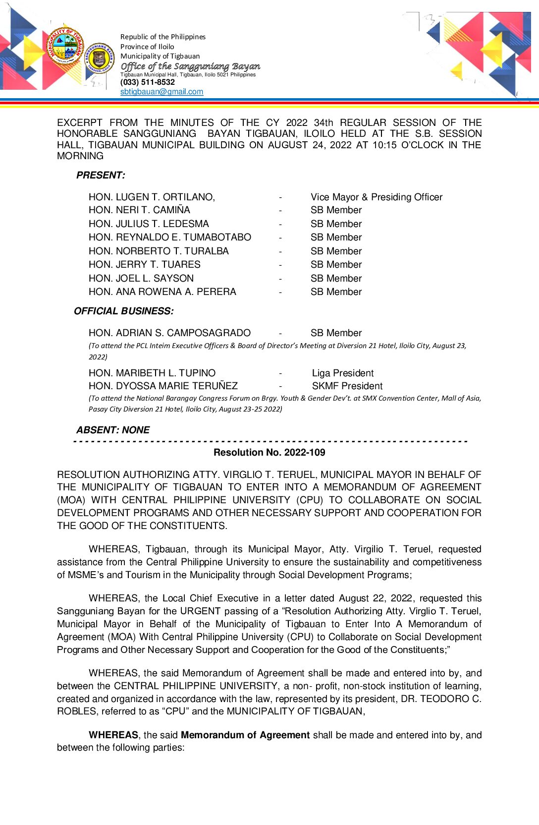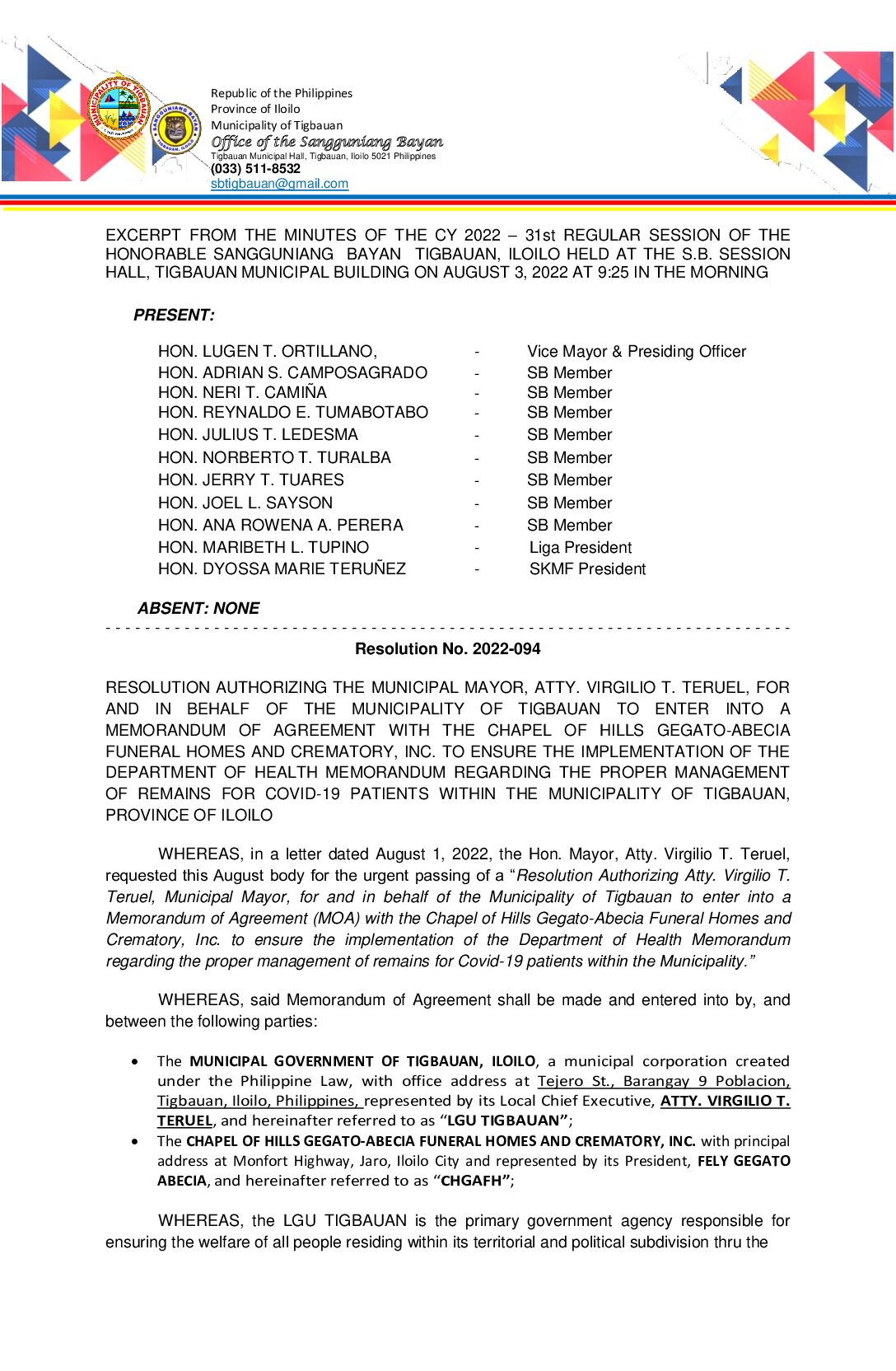Resolution No. 2022-094 – RESOLUTION AUTHORIZING THE MUNICIPAL MAYOR, ATTY. VIRGILIO T. TERUEL, FOR AND IN BEHALF OF THE MUNICIPALITY OF TIGBAUAN TO ENTER INTO A MEMORANDUM OF AGREEMENT WITH THE CHAPEL OF HILLS GEGATO-ABECIA FUNERAL HOMES AND CREMATORY, INC. TO ENSURE THE IMPLEMENTATION OF THE DEPARTMENT OF HEALTH MEMORANDUM REGARDING THE PROPER MANAGEMENT OF REMAINS FOR COVID-19 PATIENTS WITHIN THE MUNICIPALITY OF TIGBAUAN, PROVINCE OF ILOILO