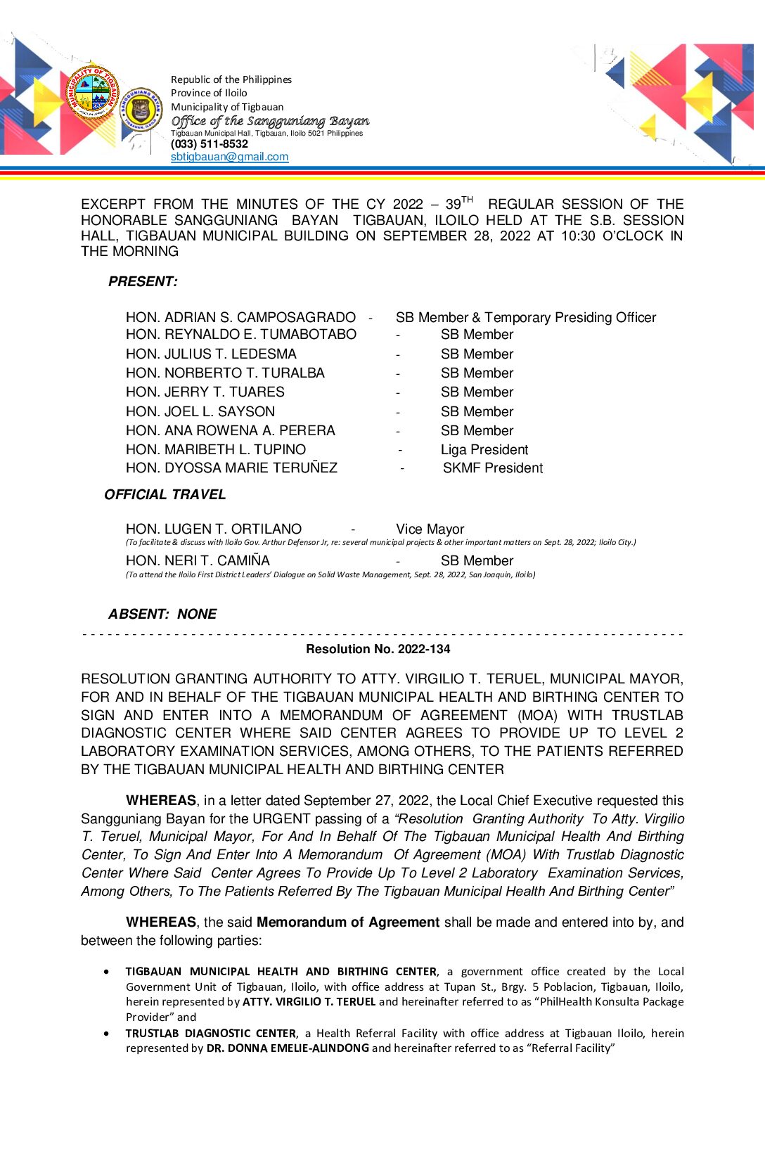 Resolution No. 2022-134 – RESOLUTION GRANTING AUTHORITY TO ATTY. VIRGILIO T. TERUEL, MUNICIPAL MAYOR, FOR AND IN BEHALF OF THE TIGBAUAN MUNICIPAL HEALTH AND BIRTHING CENTER TO SIGN AND ENTER INTO A MEMORANDUM OF AGREEMENT (MOA) WITH TRUSTLAB DIAGNOSTIC CENTER WHERE SAID CENTER AGREES TO PROVIDE UP TO LEVEL 2 LABORATORY EXAMINATION SERVICES, AMONG OTHERS, TO THE PATIENTS REFERRED BY THE TIGBAUAN MUNICIPAL HEALTH AND BIRTHING CENTER