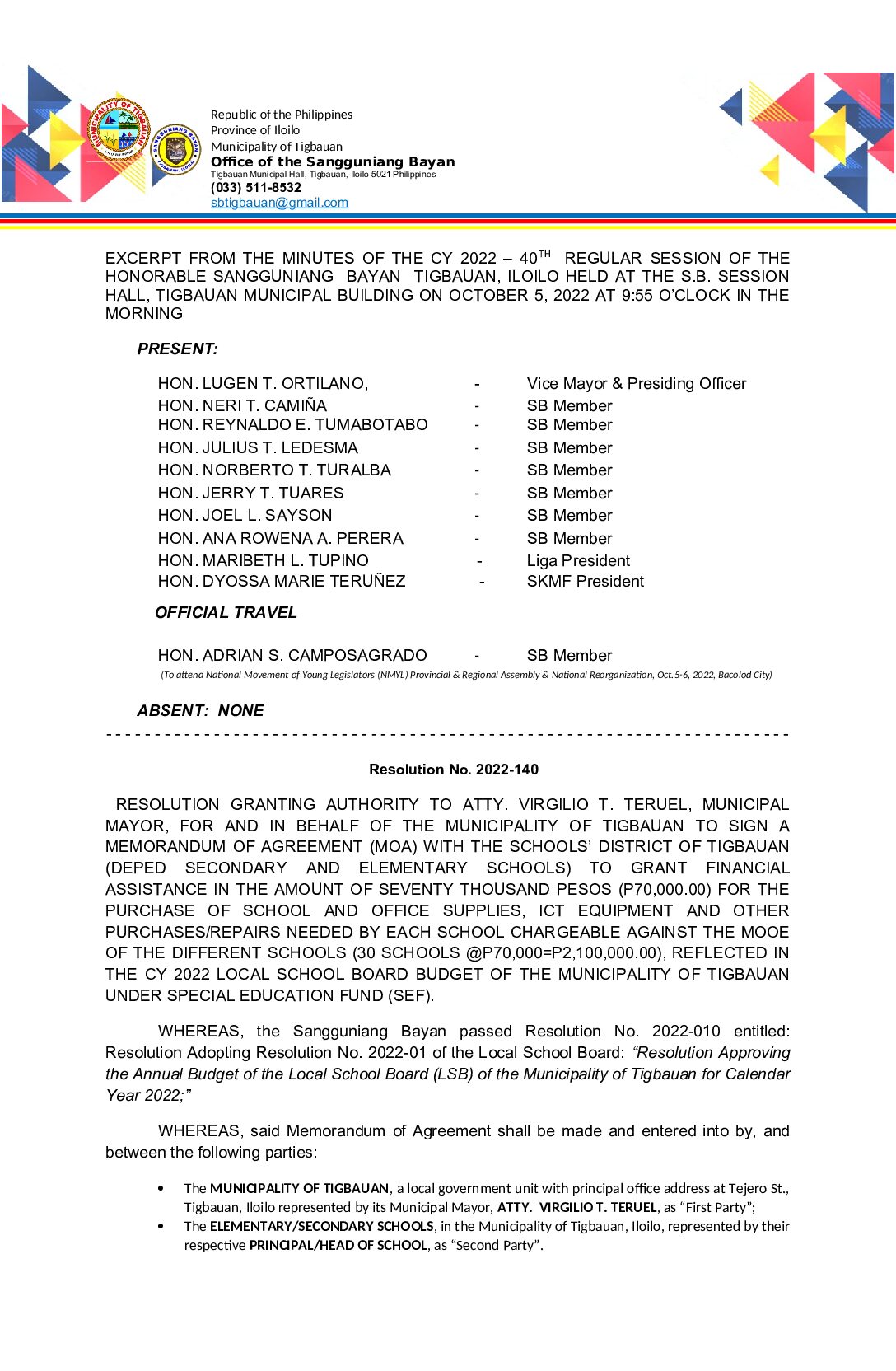Resolution No. 2022-140 – RESOLUTION GRANTING AUTHORITY TO ATTY. VIRGILIO T. TERUEL, MUNICIPAL MAYOR, FOR AND IN BEHALF OF THE MUNICIPALITY OF TIGBAUAN TO SIGN A MEMORANDUM OF AGREEMENT (MOA) WITH THE SCHOOLS’ DISTRICT OF TIGBAUAN (DEPED SECONDARY AND ELEMENTARY SCHOOLS) TO GRANT FINANCIAL ASSISTANCE IN THE AMOUNT OF SEVENTY THOUSAND PESOS (P70,000.00) FOR THE PURCHASE OF SCHOOL AND OFFICE SUPPLIES, ICT EQUIPMENT AND OTHER PURCHASES/REPAIRS NEEDED BY EACH SCHOOL CHARGEABLE AGAINST THE MOOE OF THE DIFFERENT SCHOOLS (30 SCHOOLS @P70,000=P2,100,000.00), REFLECTED IN THE CY 2022 LOCAL SCHOOL BOARD BUDGET OF THE MUNICIPALITY OF TIGBAUAN UNDER SPECIAL EDUCATION FUND (SEF).