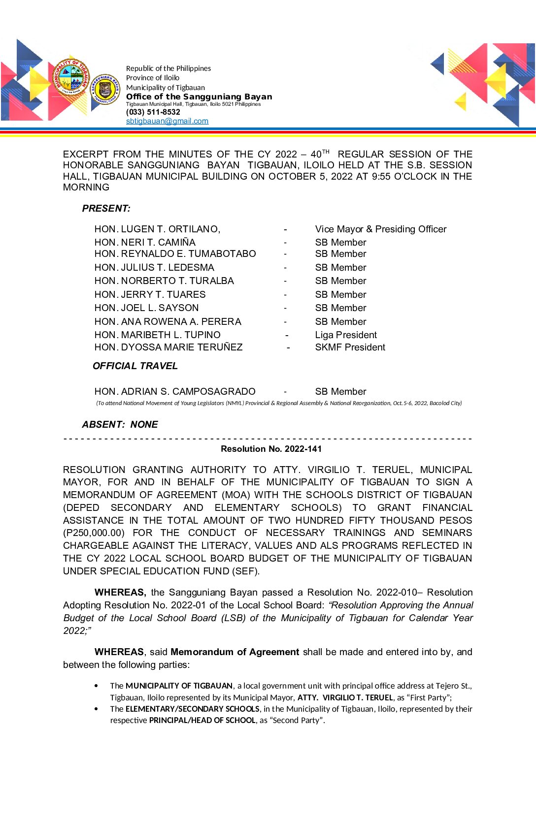 Resolution No. 2022-141 – RESOLUTION GRANTING AUTHORITY TO ATTY. VIRGILIO T. TERUEL, MUNICIPAL MAYOR, FOR AND IN BEHALF OF THE MUNICIPALITY OF TIGBAUAN TO SIGN A MEMORANDUM OF AGREEMENT (MOA) WITH THE SCHOOLS DISTRICT OF TIGBAUAN (DEPED SECONDARY AND ELEMENTARY SCHOOLS) TO GRANT FINANCIAL ASSISTANCE IN THE TOTAL AMOUNT OF TWO HUNDRED FIFTY THOUSAND PESOS (P250,000.00) FOR THE CONDUCT OF NECESSARY TRAININGS AND SEMINARS CHARGEABLE AGAINST THE LITERACY, VALUES AND ALS PROGRAMS REFLECTED IN THE CY 2022 LOCAL SCHOOL BOARD BUDGET OF THE MUNICIPALITY OF TIGBAUAN UNDER SPECIAL EDUCATION FUND (SEF).