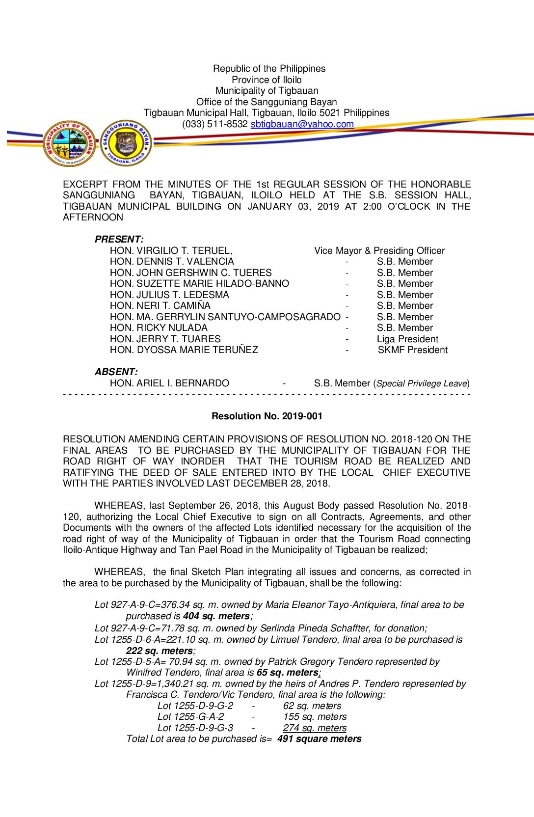 Resolution No. 2019-001 – RESOLUTION AMENDING CERTAIN PROVISIONS OF RESOLUTION NO. 2018-120 ON THE FINAL AREAS TO BE PURCHASED BY THE MUNICIPALITY OF TIGBAUAN FOR THE ROAD RIGHT OF WAY INORDER THAT THE TOURISM ROAD BE REALIZED AND RATIFYING THE DEED OF SALE ENTERED INTO BY THE LOCAL CHIEF EXECUTIVE WITH THE PARTIES INVOLVED LAST DECEMBER 28, 2018.
