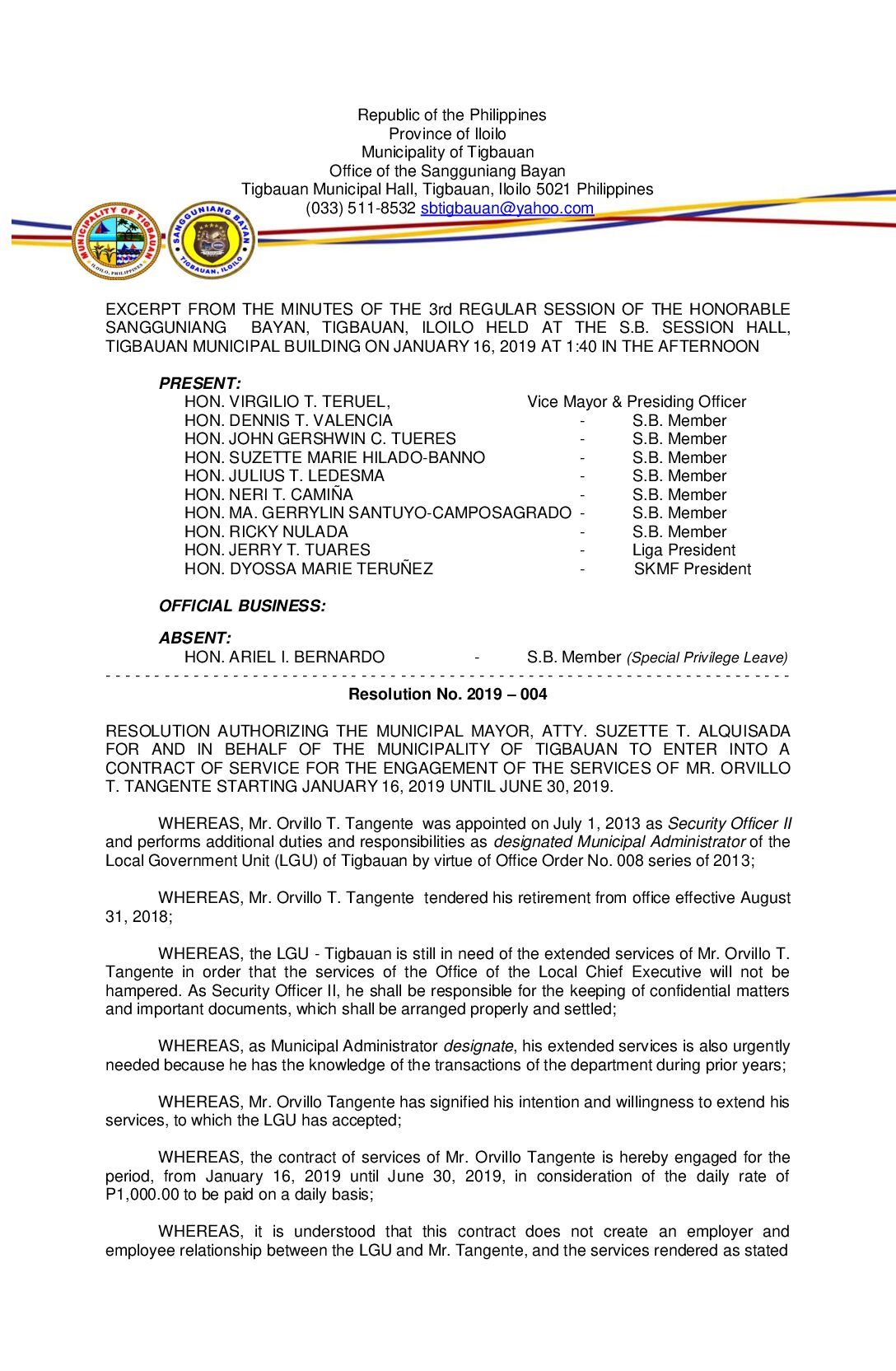 Resolution No. 2019-004 – RESOLUTION AUTHORIZING THE MUNICIPAL MAYOR, ATTY. SUZETTE T. ALQUISADA FOR AND IN BEHALF OF THE MUNICIPALITY OF TIGBAUAN TO ENTER INTO A CONTRACT OF SERVICE FOR THE ENGAGEMENT OF THE SERVICES OF MR. ORVILLO T. TANGENTE STARTING JANUARY 16, 2019 UNTIL JUNE 30, 2019.