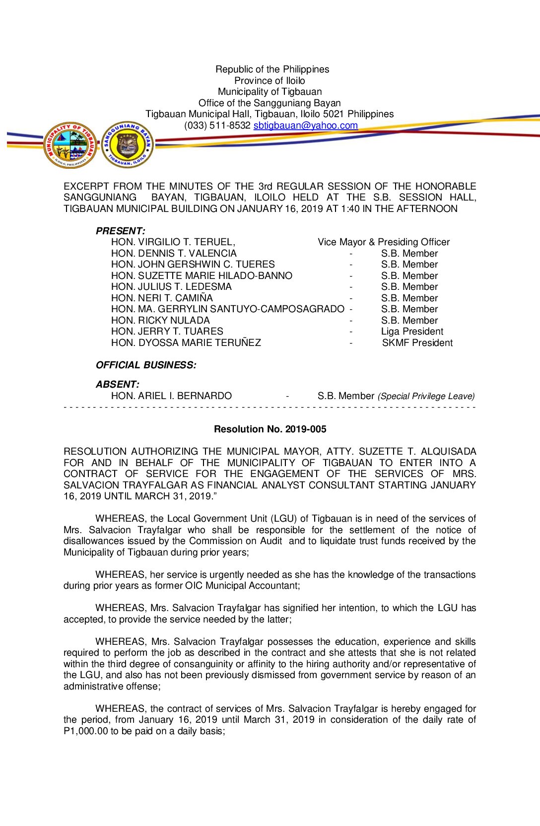 Resolution No. 2019-005 – RESOLUTION AUTHORIZING THE MUNICIPAL MAYOR, ATTY. SUZETTE T. ALQUISADA FOR AND IN BEHALF OF THE MUNICIPALITY OF TIGBAUAN TO ENTER INTO A CONTRACT OF SERVICE FOR THE ENGAGEMENT OF THE SERVICES OF MRS. SALVACION TRAYFALGAR AS FINANCIAL ANALYST CONSULTANT STARTING JANUARY 16, 2019 UNTIL MARCH 31, 2019.”