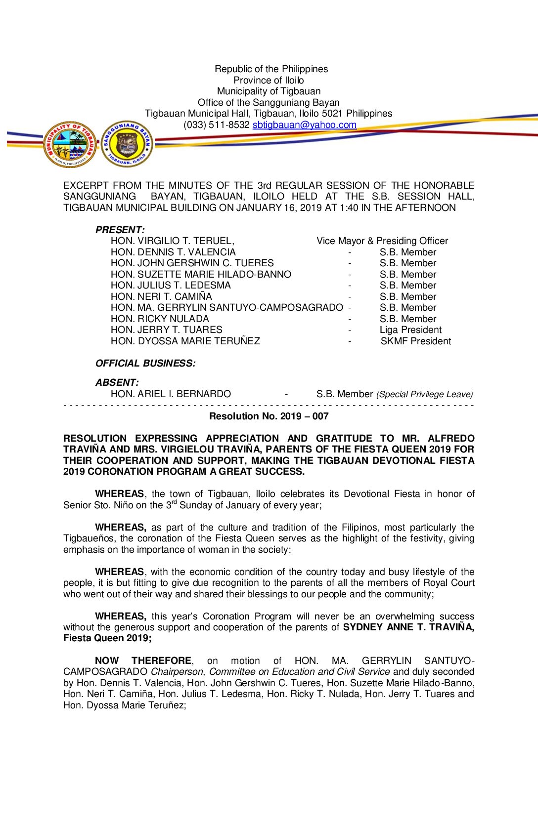 Resolution No. 2019-007 – RESOLUTION EXPRESSING APPRECIATION AND GRATITUDE TO MR. ALFREDO TRAVIÑA AND MRS. VIRGIELOU TRAVIÑA, PARENTS OF THE FIESTA QUEEN 2019 FOR THEIR COOPERATION AND SUPPORT, MAKING THE TIGBAUAN DEVOTIONAL FIESTA 2019 CORONATION PROGRAM A GREAT SUCCESS.