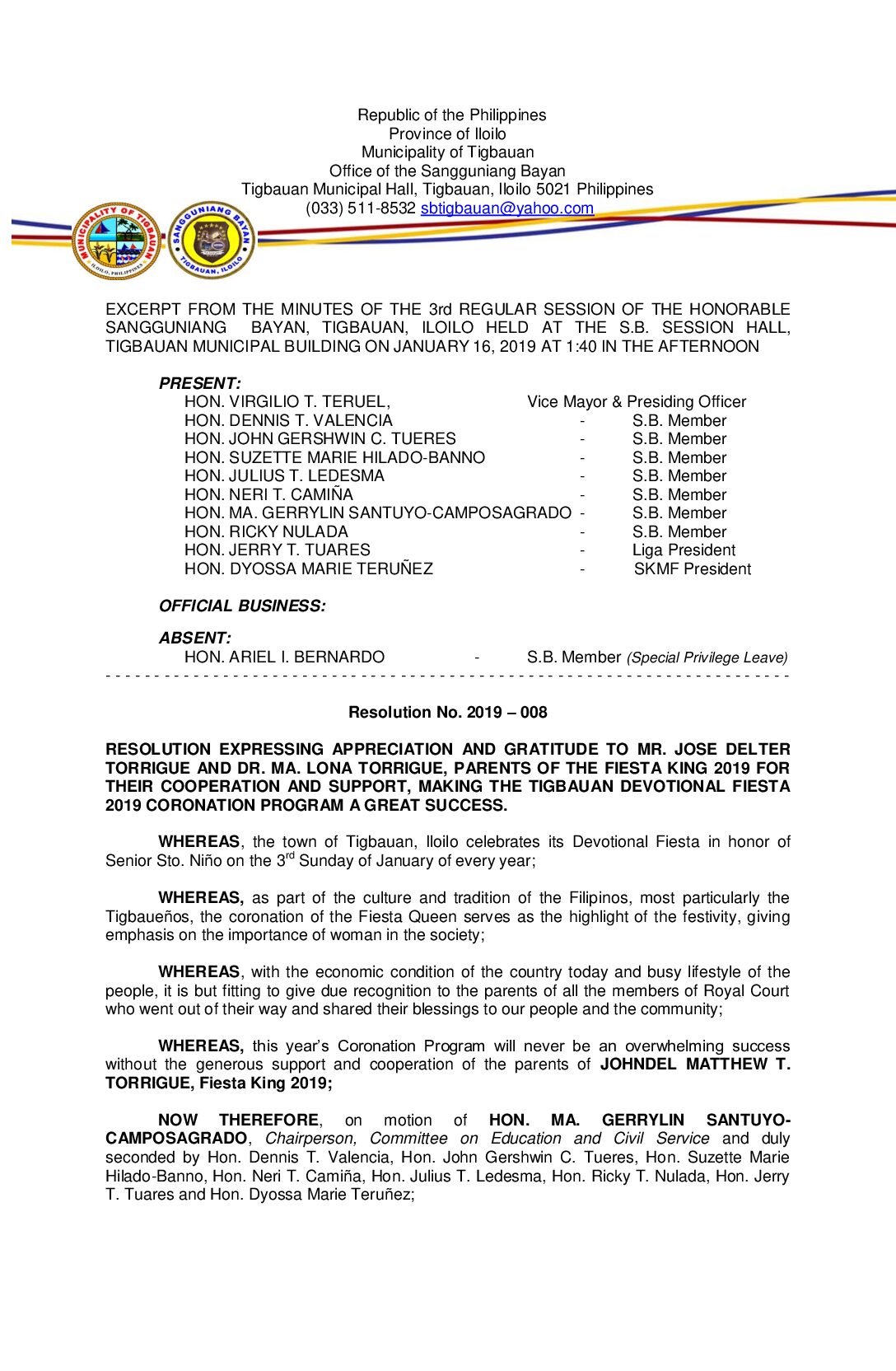 Resolution No. 2019-008 – RESOLUTION EXPRESSING APPRECIATION AND GRATITUDE TO MR. JOSE DELTER TORRIGUE AND DR. MA. LONA TORRIGUE, PARENTS OF THE FIESTA KING 2019 FOR THEIR COOPERATION AND SUPPORT, MAKING THE TIGBAUAN DEVOTIONAL FIESTA 2019 CORONATION PROGRAM A GREAT SUCCESS.
