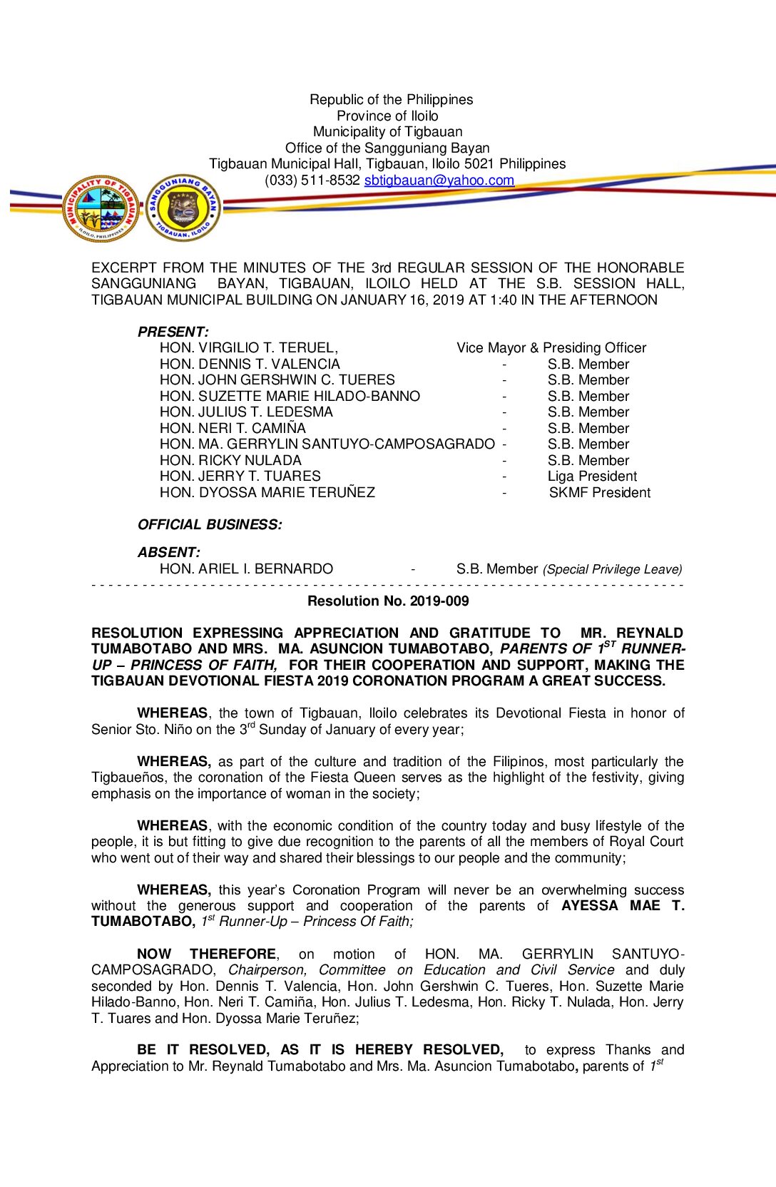 Resolution No. 2019-009 – RESOLUTION EXPRESSING APPRECIATION AND GRATITUDE TO MR. REYNALD TUMABOTABO AND MRS. MA. ASUNCION TUMABOTABO, PARENTS OF 1ST RUNNER- UP – PRINCESS OF FAITH, FOR THEIR COOPERATION AND SUPPORT, MAKING THE TIGBAUAN DEVOTIONAL FIESTA 2019 CORONATION PROGRAM A GREAT SUCCESS.