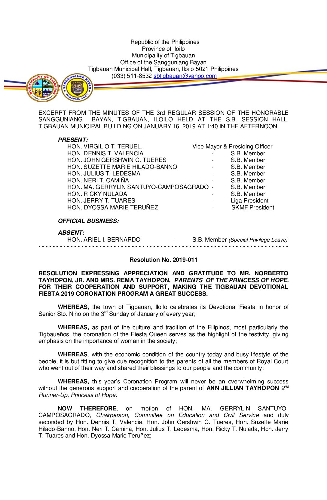 Resolution No. 2019-011 – RESOLUTION EXPRESSING APPRECIATION AND GRATITUDE TO MR. NORBERTO TAYHOPON, JR. AND MRS. REMA TAYHOPON, PARENTS OF THE PRINCESS OF HOPE, FOR THEIR COOPERATION AND SUPPORT, MAKING THE TIGBAUAN DEVOTIONAL FIESTA 2019 CORONATION PROGRAM A GREAT SUCCESS.