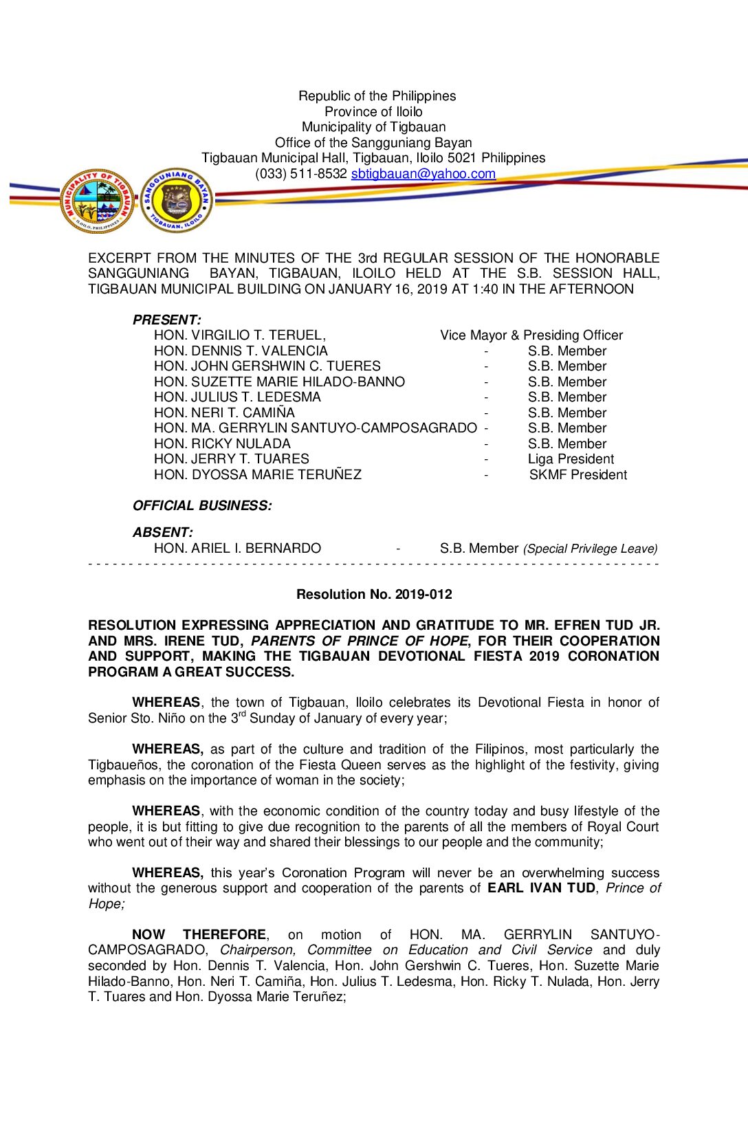 Resolution No. 2019-012 – RESOLUTION EXPRESSING APPRECIATION AND GRATITUDE TO MR. EFREN TUD JR. AND MRS. IRENE TUD, PARENTS OF PRINCE OF HOPE, FOR THEIR COOPERATION AND SUPPORT, MAKING THE TIGBAUAN DEVOTIONAL FIESTA 2019 CORONATION PROGRAM A GREAT SUCCESS.