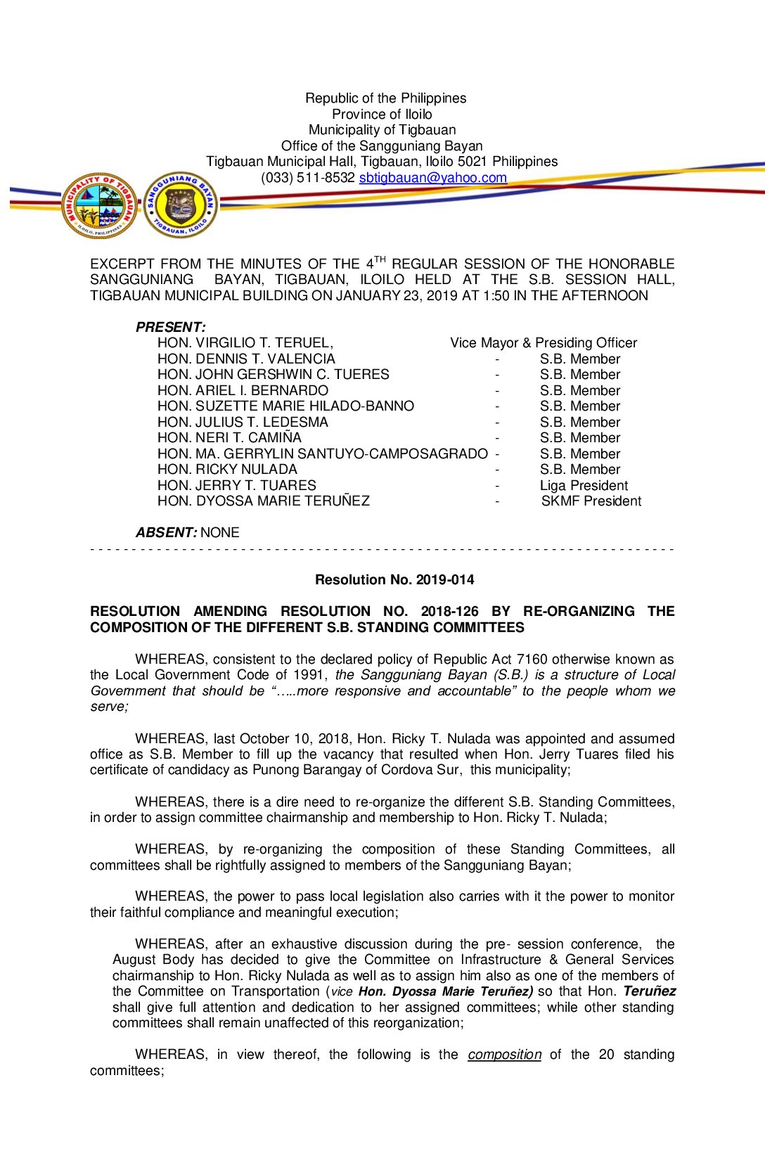 Resolution No. 2019-014 – RESOLUTION AMENDING RESOLUTION NO. 2018-126 BY RE-ORGANIZING THE COMPOSITION OF THE DIFFERENT S.B. STANDING COMMITTEES