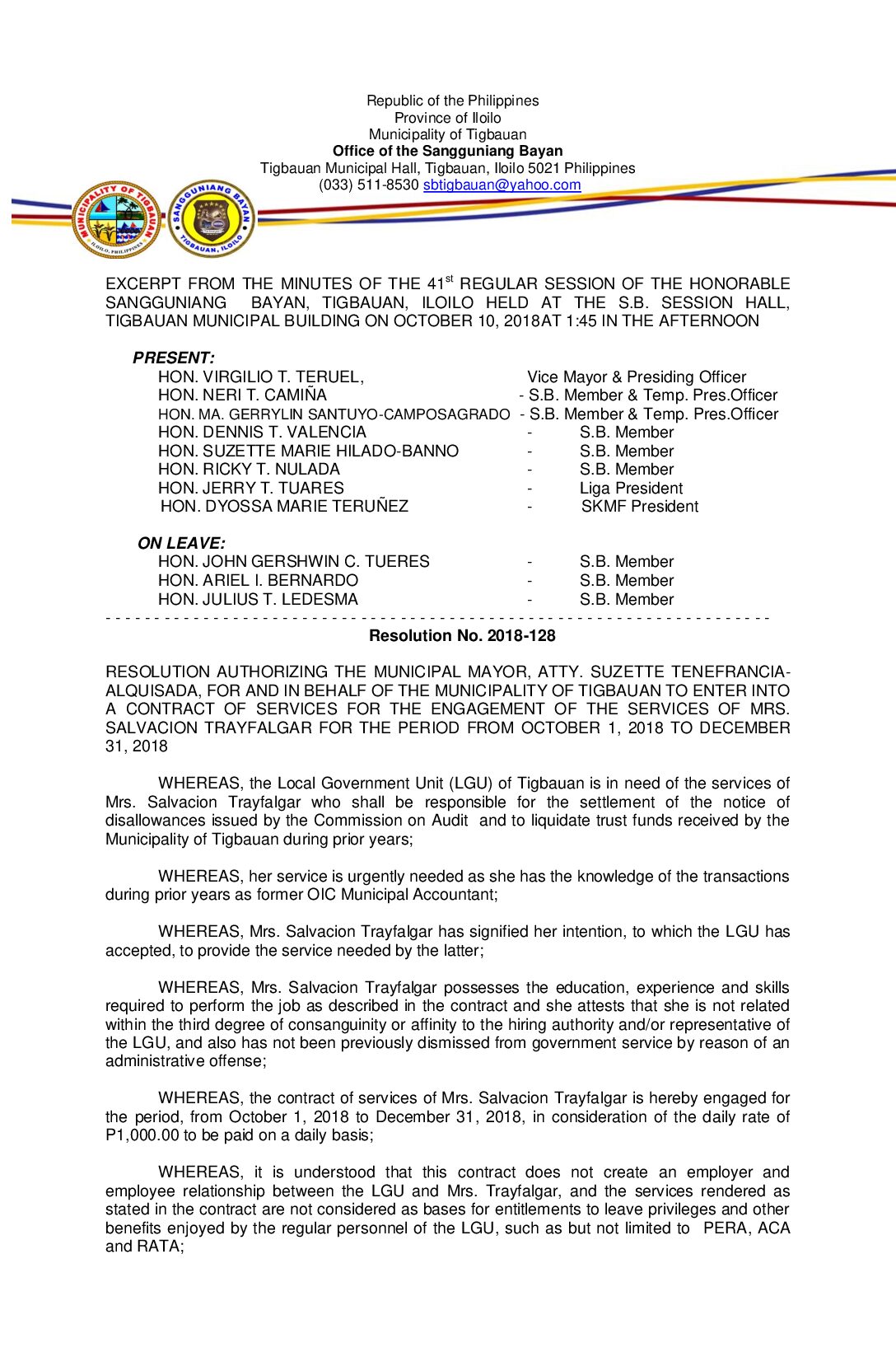 Resolution No. 2018-128 – RESOLUTION AUTHORIZING THE MUNICIPAL MAYOR, ATTY. SUZETTE TENEFRANCIA- ALQUISADA, FOR AND IN BEHALF OF THE MUNICIPALITY OF TIGBAUAN TO ENTER INTO A CONTRACT OF SERVICES FOR THE ENGAGEMENT OF THE SERVICES OF MRS. SALVACION TRAYFALGAR FOR THE PERIOD FROM OCTOBER 1, 2018 TO DECEMBER 31, 2018