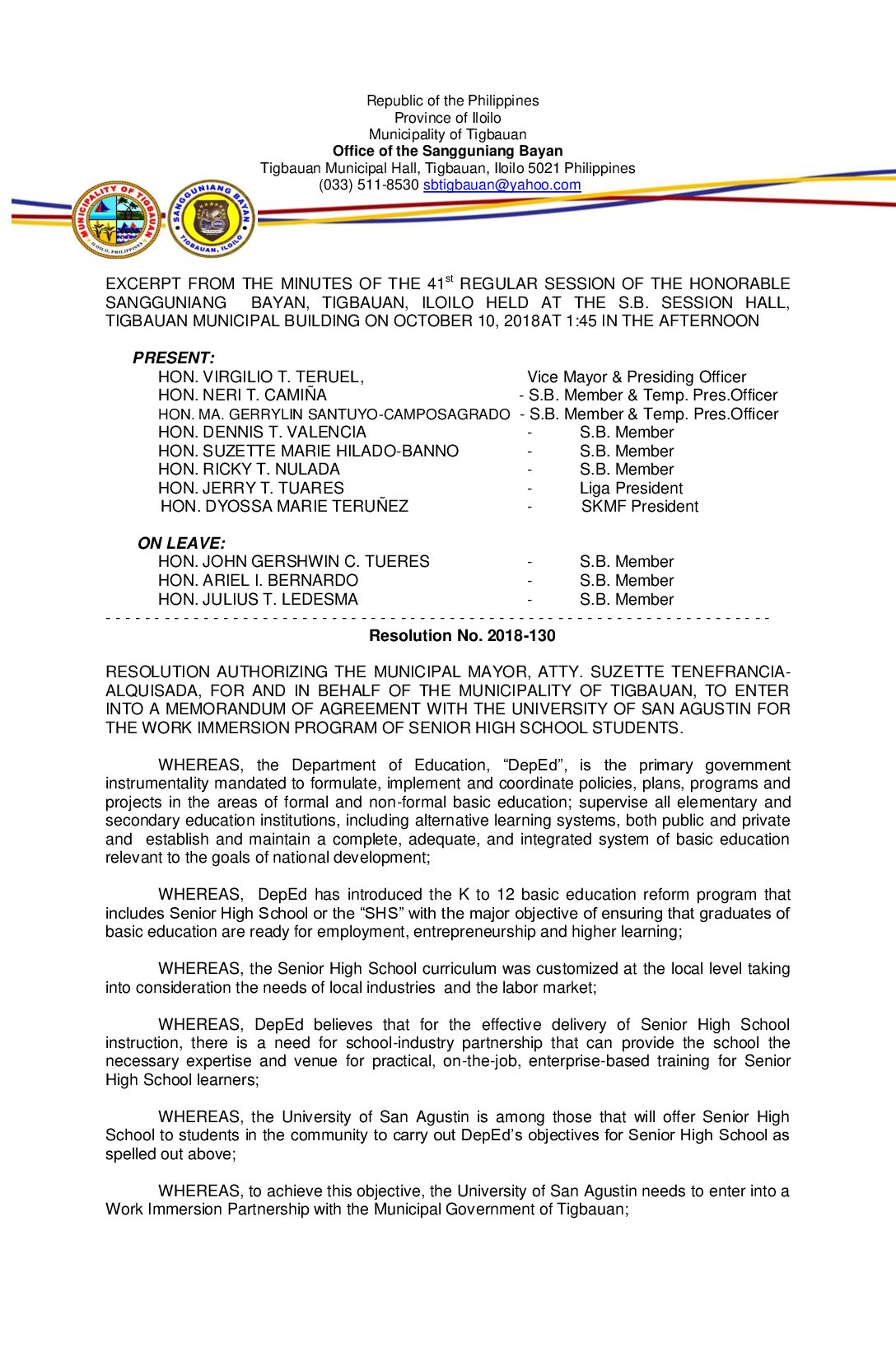 Resolution No. 2018-130 – RESOLUTION AUTHORIZING THE MUNICIPAL MAYOR, ATTY. SUZETTE TENEFRANCIA- ALQUISADA, FOR AND IN BEHALF OF THE MUNICIPALITY OF TIGBAUAN, TO ENTER INTO A MEMORANDUM OF AGREEMENT WITH THE UNIVERSITY OF SAN AGUSTIN FOR THE WORK IMMERSION PROGRAM OF SENIOR HIGH SCHOOL STUDENTS.