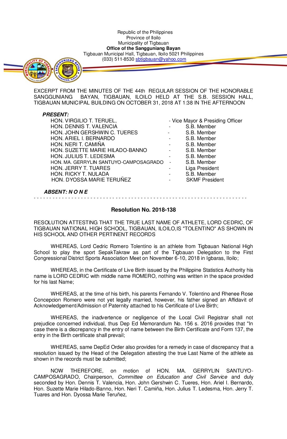 Resolution No. 2018-138 – RESOLUTION ATTESTING THAT THE TRUE LAST NAME OF ATHLETE, LORD CEDRIC, OF TIGBAUAN NATIONAL HIGH SCHOOL, TIGBAUAN, ILOILO,IS “TOLENTINO” AS SHOWN IN HIS SCHOOL AND OTHER PERTINENT RECORDS