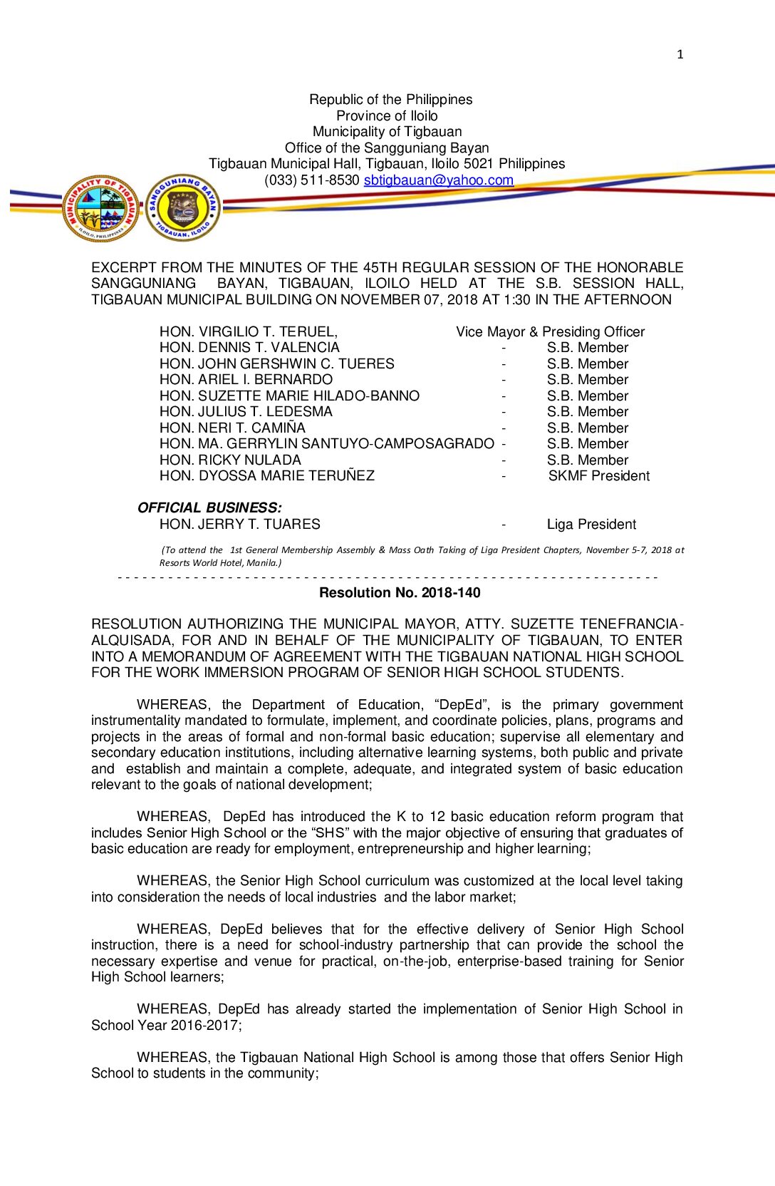 Resolution No. 2018-140 – RESOLUTION AUTHORIZING THE MUNICIPAL MAYOR, ATTY. SUZETTE TENEFRANCIA- ALQUISADA, FOR AND IN BEHALF OF THE MUNICIPALITY OF TIGBAUAN, TO ENTER INTO A MEMORANDUM OF AGREEMENT WITH THE TIGBAUAN NATIONAL HIGH SCHOOL FOR THE WORK IMMERSION PROGRAM OF SENIOR HIGH SCHOOL STUDENTS.
