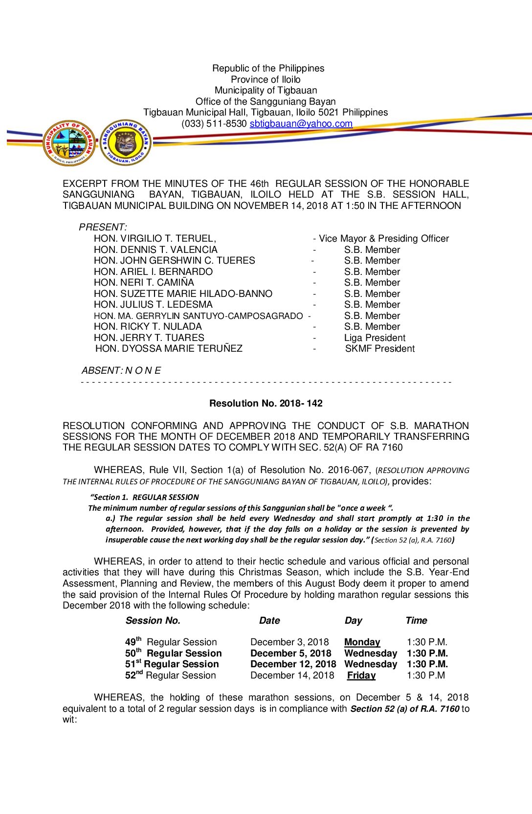 Resolution No. 2018-142 – RESOLUTION CONFORMING AND APPROVING THE CONDUCT OF S.B. MARATHON SESSIONS FOR THE MONTH OF DECEMBER 2018 AND TEMPORARILY TRANSFERRING THE REGULAR SESSION DATES TO COMPLY WITH SEC. 52(A) OF RA 7160