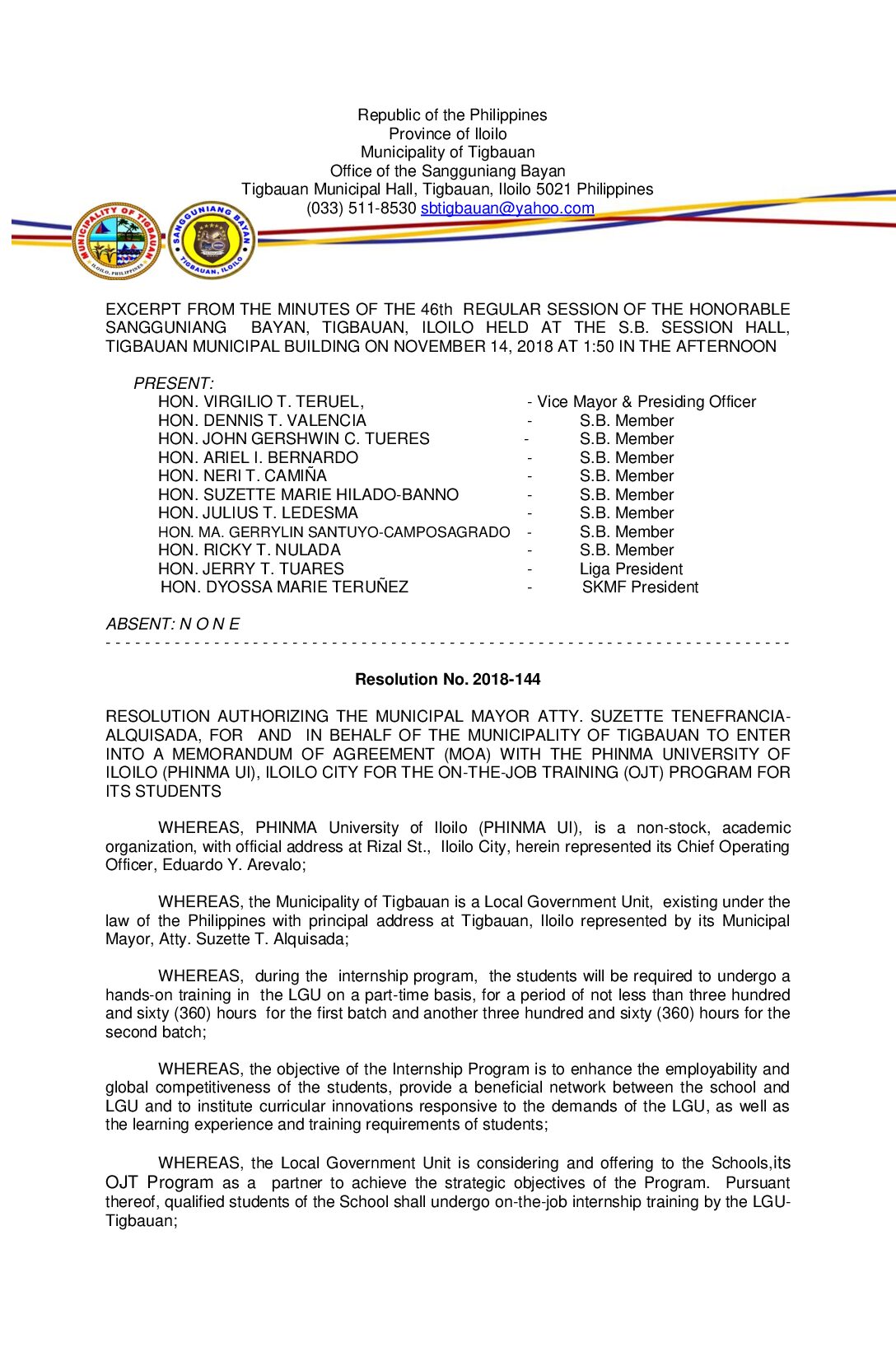 Resolution No. 2018-144 – RESOLUTION AUTHORIZING THE MUNICIPAL MAYOR ATTY. SUZETTE TENEFRANCIA- ALQUISADA, FOR AND IN BEHALF OF THE MUNICIPALITY OF TIGBAUAN TO ENTER INTO A MEMORANDUM OF AGREEMENT (MOA) WITH THE PHINMA UNIVERSITY OF ILOILO (PHINMA UI), ILOILO CITY FOR THE ON-THE-JOB TRAINING (OJT) PROGRAM FOR ITS STUDENTS