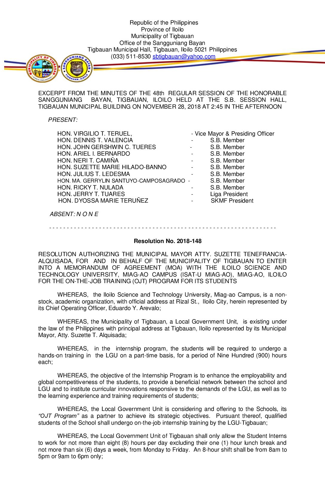 Resolution No. 2018-148 – RESOLUTION AUTHORIZING THE MUNICIPAL MAYOR ATTY. SUZETTE TENEFRANCIA- ALQUISADA, FOR AND IN BEHALF OF THE MUNICIPALITY OF TIGBAUAN TO ENTER INTO A MEMORANDUM OF AGREEMENT (MOA) WITH THE ILOILO SCIENCE AND TECHNOLOGY UNIVERSITY, MIAG-AO CAMPUS (ISAT-U MIAG-AO), MIAG-AO, ILOILO FOR THE ON-THE-JOB TRAINING (OJT) PROGRAM FOR ITS STUDENTS