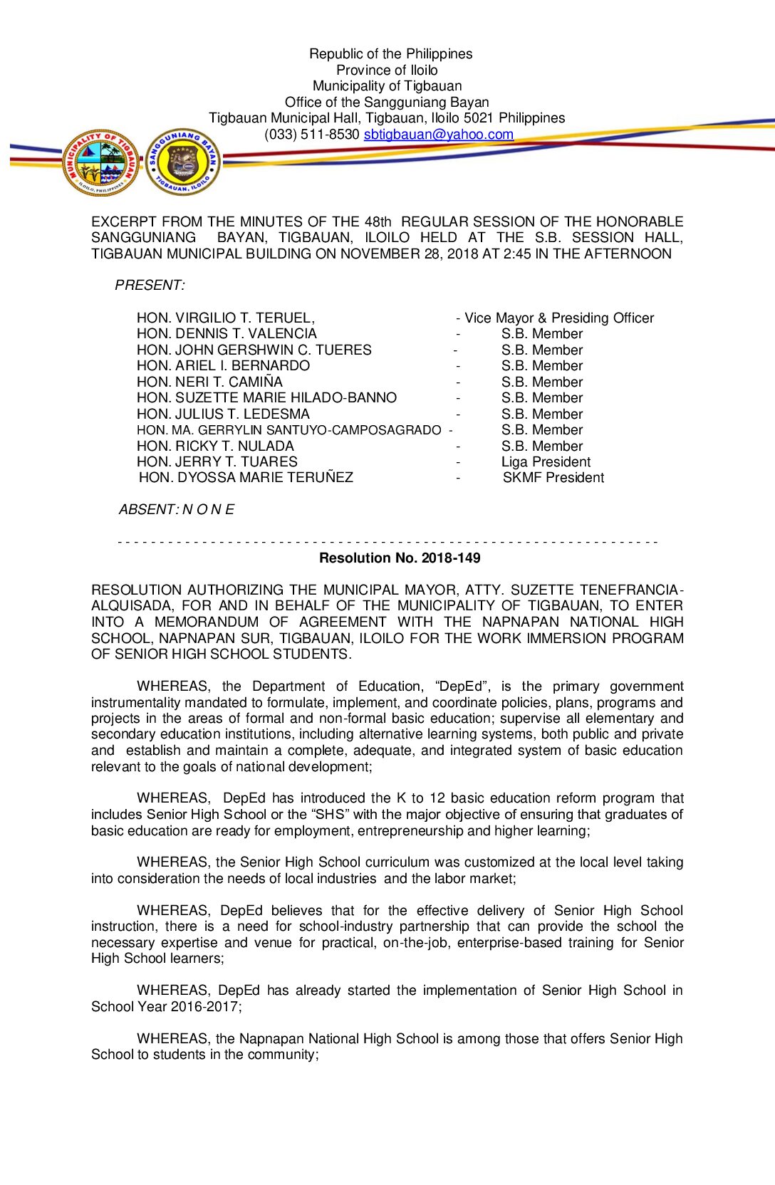Resolution No. 2018-149 – RESOLUTION AUTHORIZING THE MUNICIPAL MAYOR, ATTY. SUZETTE TENEFRANCIA- ALQUISADA, FOR AND IN BEHALF OF THE MUNICIPALITY OF TIGBAUAN, TO ENTER INTO A MEMORANDUM OF AGREEMENT WITH THE NAPNAPAN NATIONAL HIGH SCHOOL, NAPNAPAN SUR, TIGBAUAN, ILOILO FOR THE WORK IMMERSION PROGRAM OF SENIOR HIGH SCHOOL STUDENTS.
