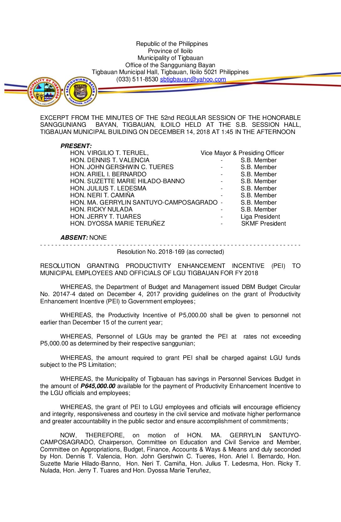 Resolution No. 2018-169 – RESOLUTION GRANTING PRODUCTIVITY ENHANCEMENT INCENTIVE (PEI) TO MUNICIPAL EMPLOYEES AND OFFICIALS OF LGU TIGBAUAN FOR FY 2018