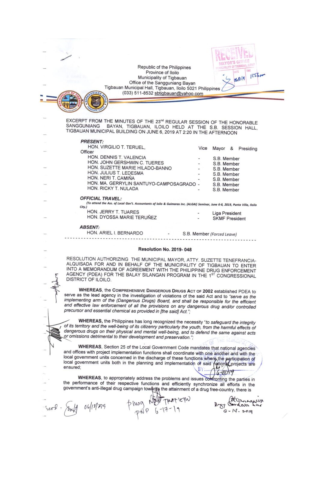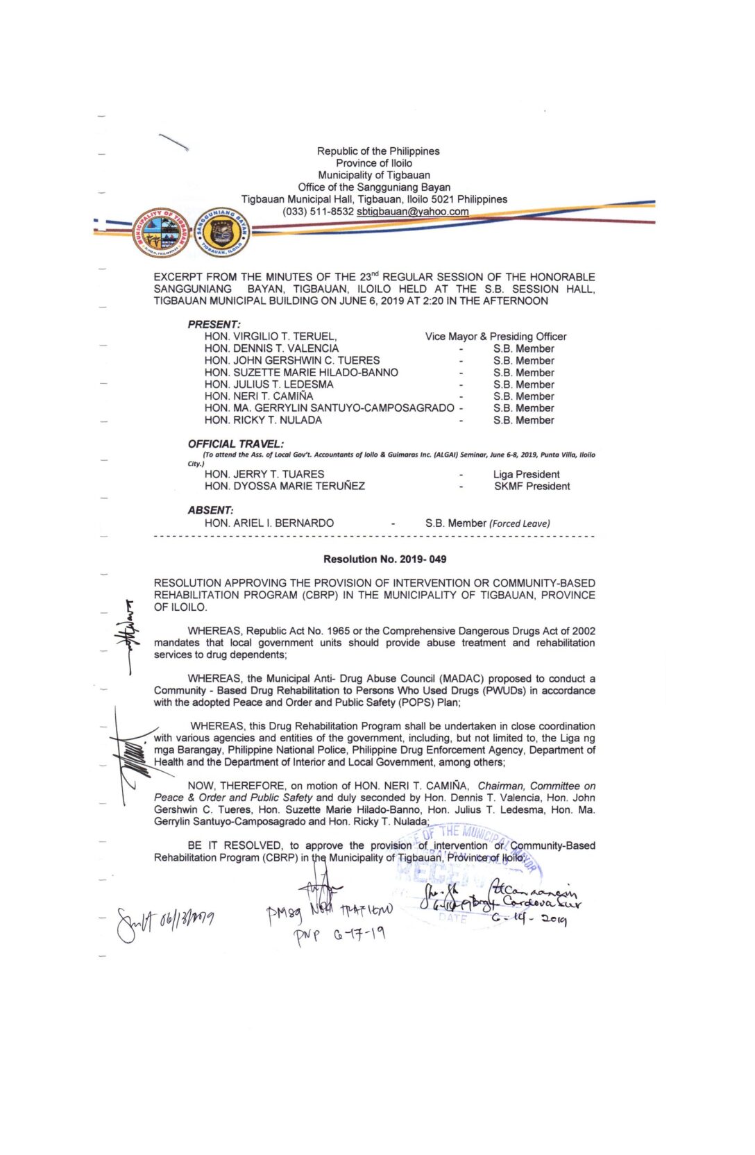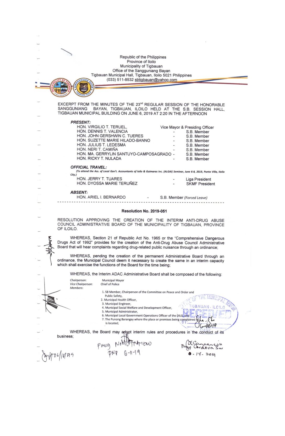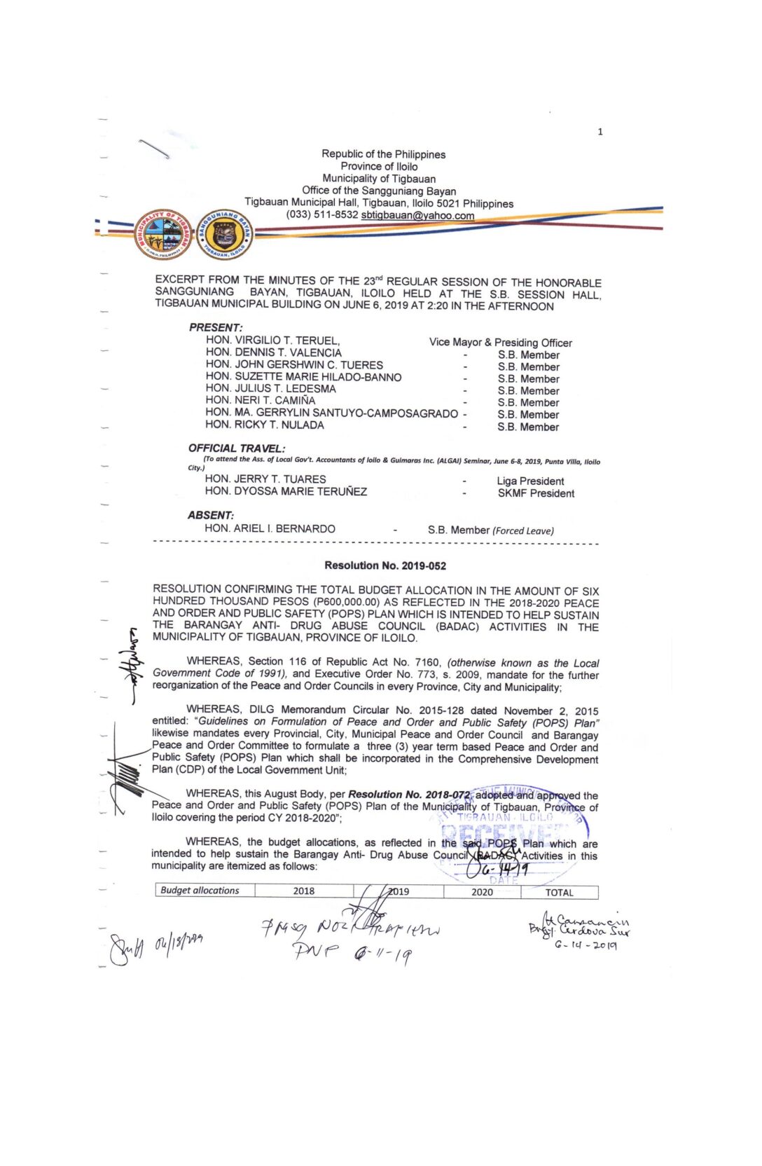 Resolution No. 2019-052 – RESOLUTION CONFORMING THE TOTAL BUDGET ALLOCATION IN THE AMOUNT OF SIX HUNDRED THOUSAND PESOS (P600,000.00) AS REFLECTED IN THE 2018-2020 PEACE AND ORDER AND PUBLIC SAFETY (POPS) PLAN WHICH IS INTENDED TO HELP SUSTAIN THE BARANGAY ANTI-DRUG ABUSE COUNCIL (BADAC) ACTIVITIES IN THE MUNICIPALITY OF TIGBAUAN, PROVINCE OF ILOILO.