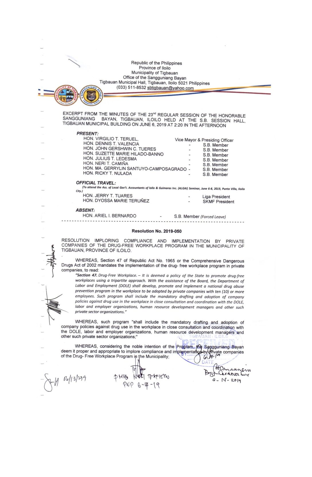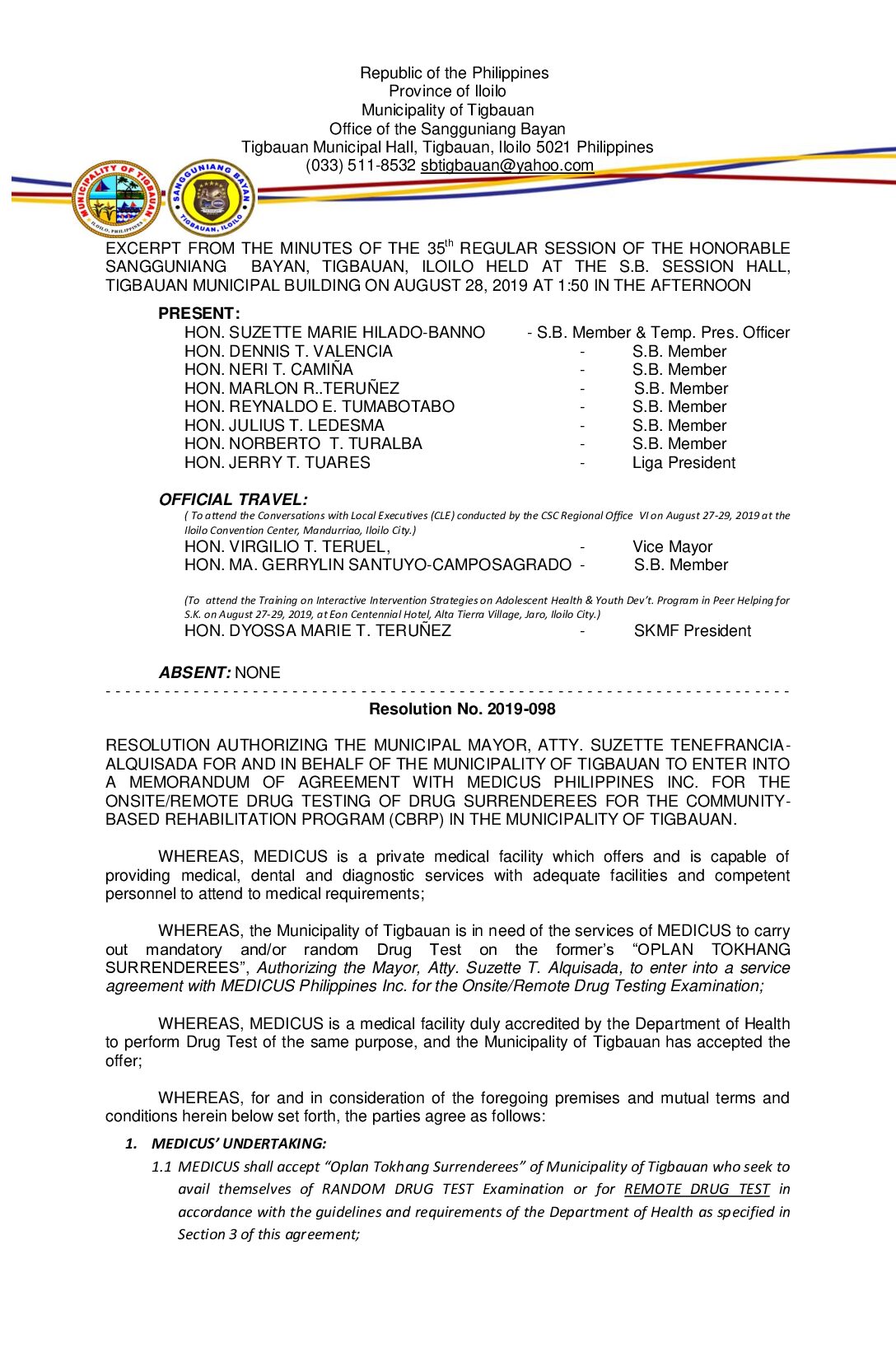 Resolution No. 2019-098 – RESOLUTION AUTHORIZING THE MUNICIPAL MAYOR, ATTY. SUZETTE TENEFRANCIA- ALQUISADA FOR AND IN BEHALF OF THE MUNICIPALITY OF TIGBAUAN TO ENTER INTO A MEMORANDUM OF AGREEMENT WITH MEDICUS PHILIPPINES INC. FOR THE ONSITE/REMOTE DRUG TESTING OF DRUG SURRENDEREES FOR THE COMMUNITY- BASED REHABILITATION PROGRAM (CBRP) IN THE MUNICIPALITY OF TIGBAUAN.