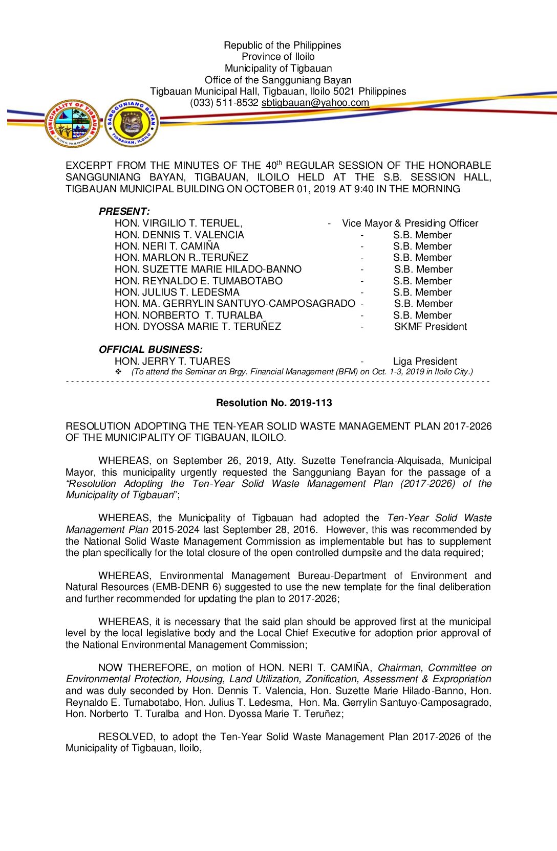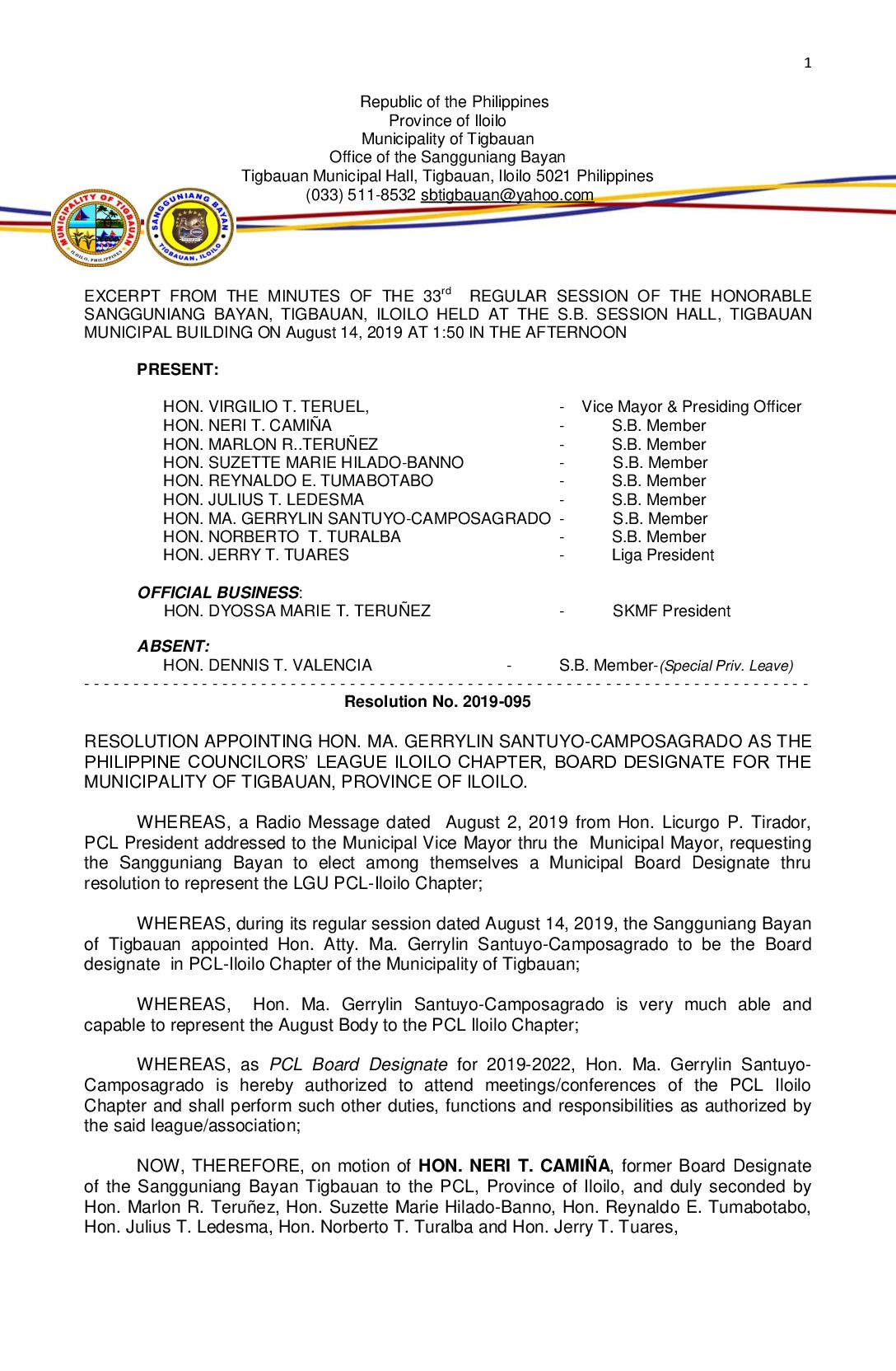 Resolution No. 2019-095 – RESOLUTION APPOINTING HON. MA. GERRYLIN SANTUYO-CAMPOSAGRADO AS THE PHILIPPINE COUNCILORS’ LEAGUE ILOILO CHAPTER, BOARD DESIGNATE FOR THE MUNICIPALITY OF TIGBAUAN, PROVINCE OF ILOILO.