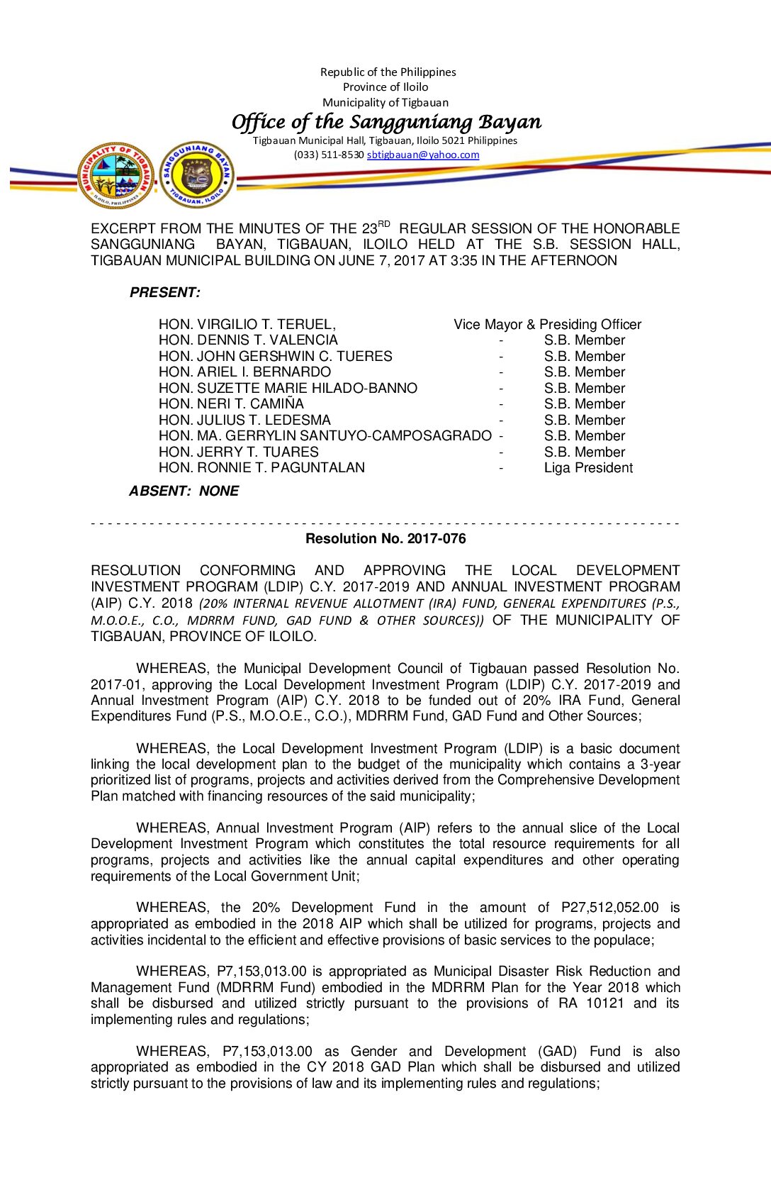 Resolution No. 2017-076 – RESOLUTION CONFORMING AND APPROVING THE LOCAL DEVELOPMENT INVESTMENT PROGRAM (LDIP) C.Y. 2017-2019 AND ANNUAL INVESTMENT PROGRAM (AIP) C.Y. 2018 (20% INTERNAL REVENUE ALLOTMENT (IRA) FUND, GENERAL EXPENDITURES (P.S., M.O.O.E., C.O., MDRRM FUND, GAD FUND & OTHER SOURCES)) OF THE MUNICIPALITY OF TIGBAUAN, PROVINCE OF ILOILO.