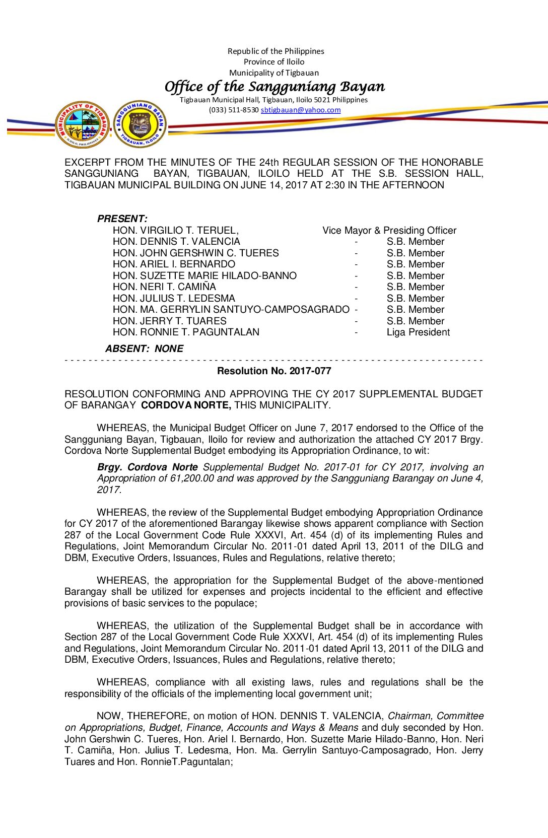 Resolution No. 2017-077 – RESOLUTION CONFORMING AND APPROVING THE CY 2017 SUPPLEMENTAL BUDGET OF BARANGAY CORDOVA NORTE, THIS MUNICIPALITY.