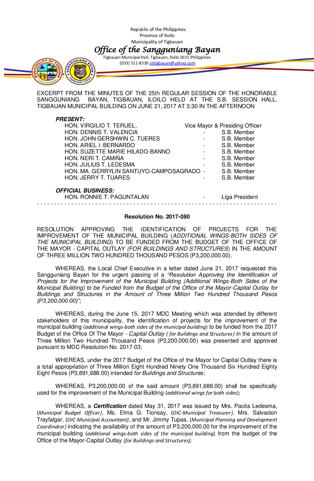 Resolution No. 2017-080 – RESOLUTION APPROVING THE IDENTIFICATION OF PROJECTS FOR THE IMPROVEMENT OF THE MUNICIPAL BUILDING (ADDITIONAL WINGS-BOTH SIDES OF THE MUNICIPAL BUILDING) TO BE FUNDED FROM THE BUDGET OF THE OFFICE OF THE MAYOR – CAPITAL OUTLAY (FOR BUILDINGS AND STRUCTURES) IN THE AMOUNT OF THREE MILLION TWO HUNDRED THOUSAND PESOS (P3,200,000.00).
