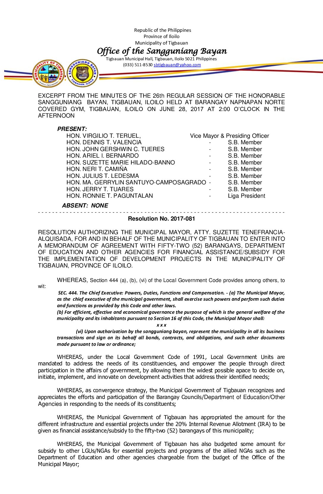 Resolution No. 2017-081 – RESOLUTION AUTHORIZING THE MUNICIPAL MAYOR, ATTY. SUZETTE TENEFRANCIA- ALQUISADA, FOR AND IN BEHALF OF THE MUNICIPALITY OF TIGBAUAN TO ENTER INTO A MEMORANDUM OF AGREEMENT WITH FIFTY-TWO (52) BARANGAYS, DEPARTMENT OF EDUCATION AND OTHER AGENCIES FOR FINANCIAL ASSISTANCE/SUBSIDY FOR THE IMPLEMENTATION OF DEVELOPMENT PROJECTS IN THE MUNICIPALITY OF TIGBAUAN, PROVINCE OF ILOILO.