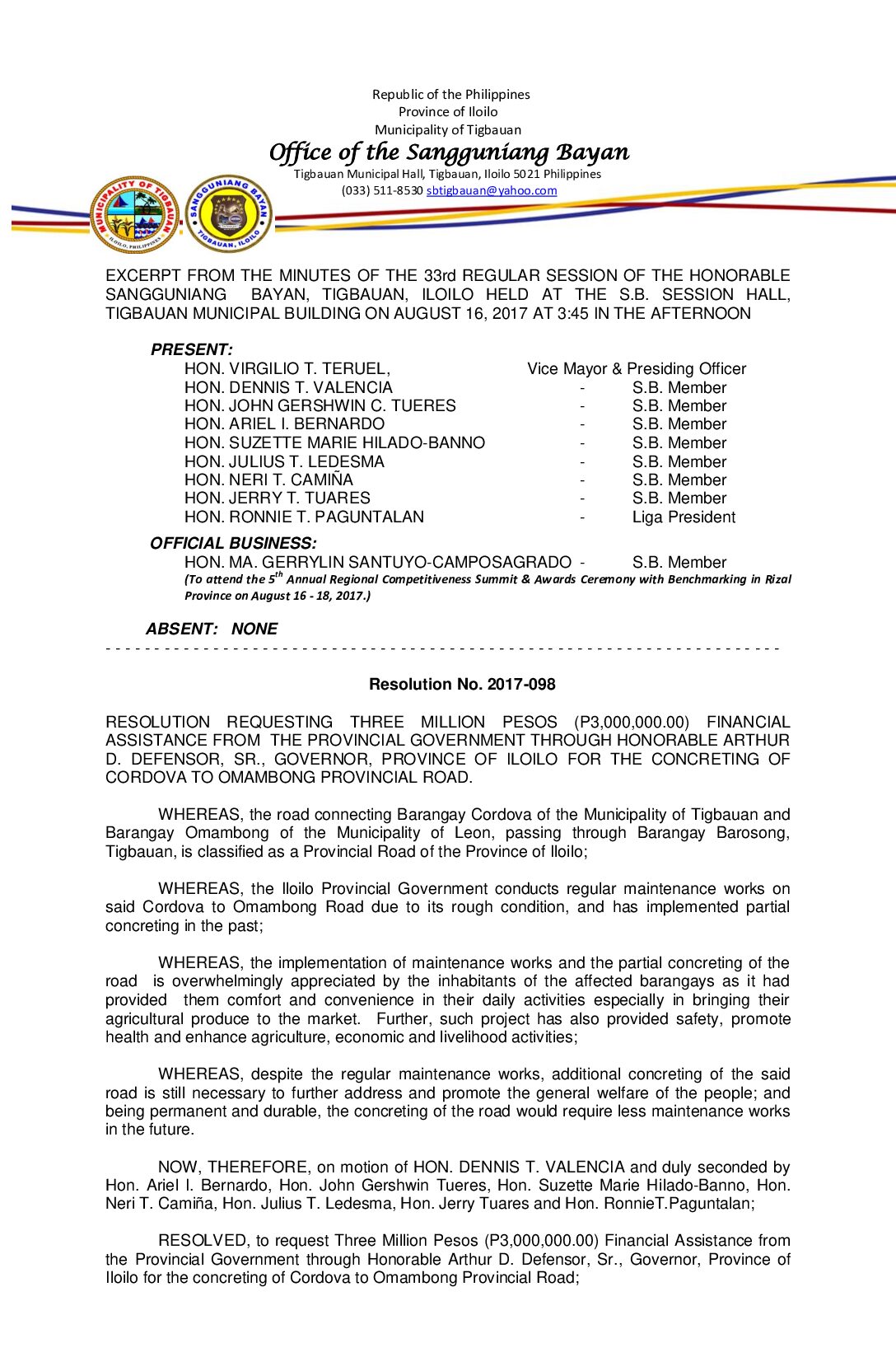 Resolution No. 2017-098 – RESOLUTION REQUESTING THREE MILLION PESOS (P3,000,000.00) FINANCIAL ASSISTANCE FROM THE PROVINCIAL GOVERNMENT THROUGH HONORABLE ARTHUR D. DEFENSOR, SR., GOVERNOR, PROVINCE OF ILOILO FOR THE CONCRETING OF CORDOVA TO OMAMBONG PROVINCIAL ROAD.