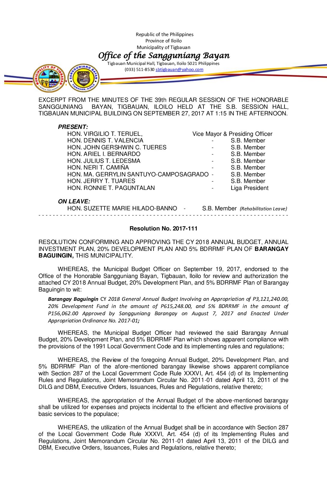 Resolution No. 2017-111 – RESOLUTION CONFORMING AND APPROVING THE CY 2018 ANNUAL BUDGET, ANNUAL INVESTMENT PLAN, 20% DEVELOPMENT PLAN AND 5% BDRRMF PLAN OF BARANGAY BAGUINGIN, THIS MUNICIPALITY.