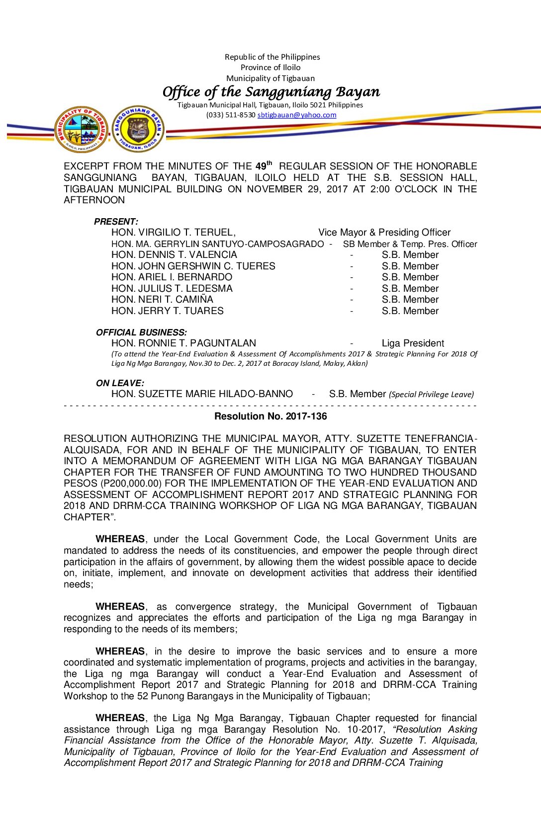 Resolution No. 2017-136 – RESOLUTION AUTHORIZING THE MUNICIPAL MAYOR, ATTY. SUZETTE TENEFRANCIA- ALQUISADA, FOR AND IN BEHALF OF THE MUNICIPALITY OF TIGBAUAN, TO ENTER INTO A MEMORANDUM OF AGREEMENT WITH LIGA NG MGA BARANGAY TIGBAUAN CHAPTER FOR THE TRANSFER OF FUND AMOUNTING TO TWO HUNDRED THOUSAND PESOS (P200,000.00) FOR THE IMPLEMENTATION OF THE YEAR-END EVALUATION AND ASSESSMENT OF ACCOMPLISHMENT REPORT 2017 AND STRATEGIC PLANNING FOR 2018 AND DRRM-CCA TRAINING WORKSHOP OF LIGA NG MGA BARANGAY, TIGBAUAN CHAPTER”.