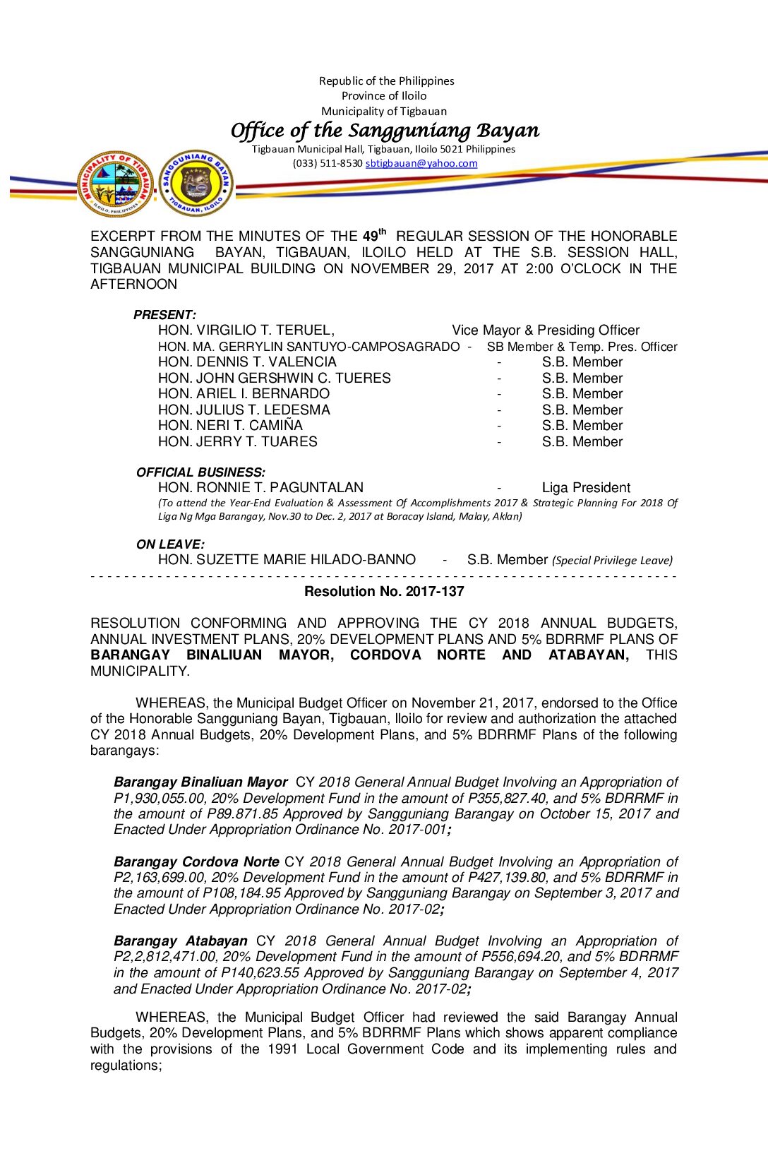 Resolution No. 2017-137 – RESOLUTION CONFORMING AND APPROVING THE CY 2018 ANNUAL BUDGETS, ANNUAL INVESTMENT PLANS, 20% DEVELOPMENT PLANS AND 5% BDRRMF PLANS OF BARANGAY BINALIUAN MAYOR, CORDOVA NORTE AND ATABAYAN, THIS MUNICIPALITY.