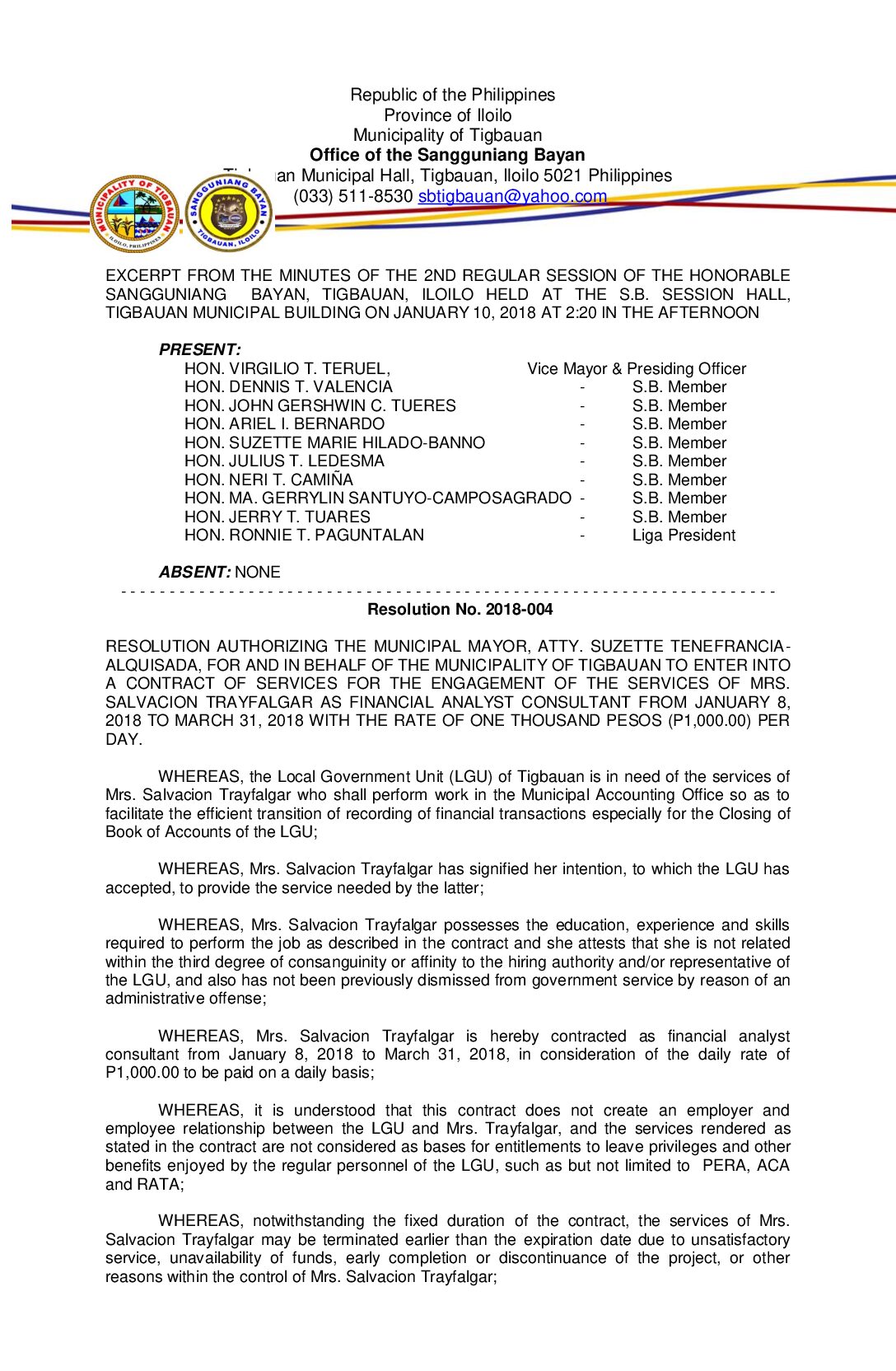 Resolution No. 2018-004 – RESOLUTION AUTHORIZING THE MUNICIPAL MAYOR, ATTY. SUZETTE TENEFRANCIA- ALQUISADA, FOR AND IN BEHALF OF THE MUNICIPALITY OF TIGBAUAN TO ENTER INTO A CONTRACT OF SERVICES FOR THE ENGAGEMENT OF THE SERVICES OF MRS. SALVACION TRAYFALGAR AS FINANCIAL ANALYST CONSULTANT FROM JANUARY 8, 2018 TO MARCH 31, 2018 WITH THE RATE OF ONE THOUSAND PESOS (P1,000.00) PER DAY.