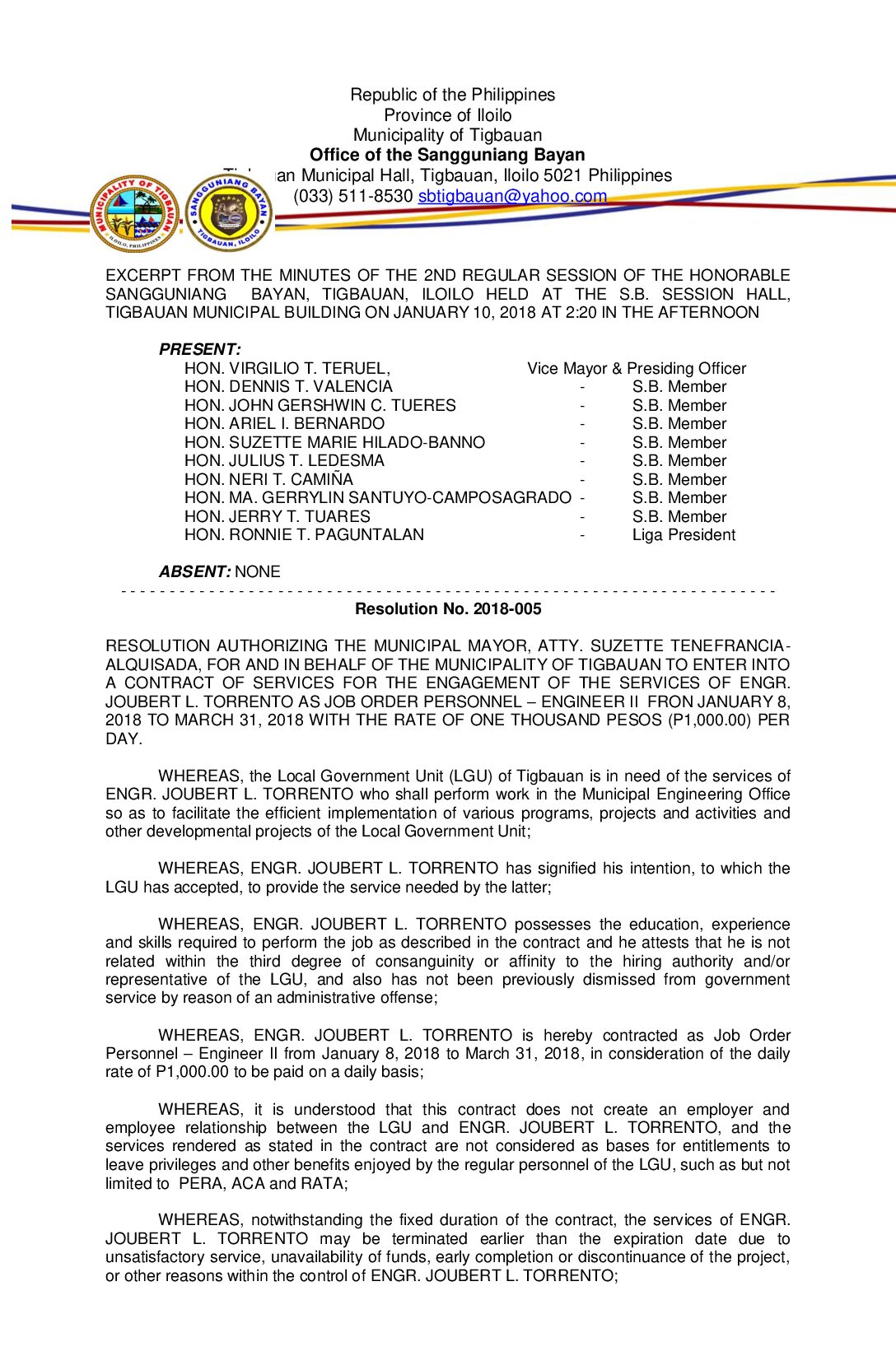 Resolution No. 2018-005 – RESOLUTION AUTHORIZING THE MUNICIPAL MAYOR, ATTY. SUZETTE TENEFRANCIA- ALQUISADA, FOR AND IN BEHALF OF THE MUNICIPALITY OF TIGBAUAN TO ENTER INTO A CONTRACT OF SERVICES FOR THE ENGAGEMENT OF THE SERVICES OF ENGR. JOUBERT L. TORRENTO AS JOB ORDER PERSONNEL – ENGINEER II FRON JANUARY 8, 2018 TO MARCH 31, 2018 WITH THE RATE OF ONE THOUSAND PESOS (P1,000.00) PER DAY.