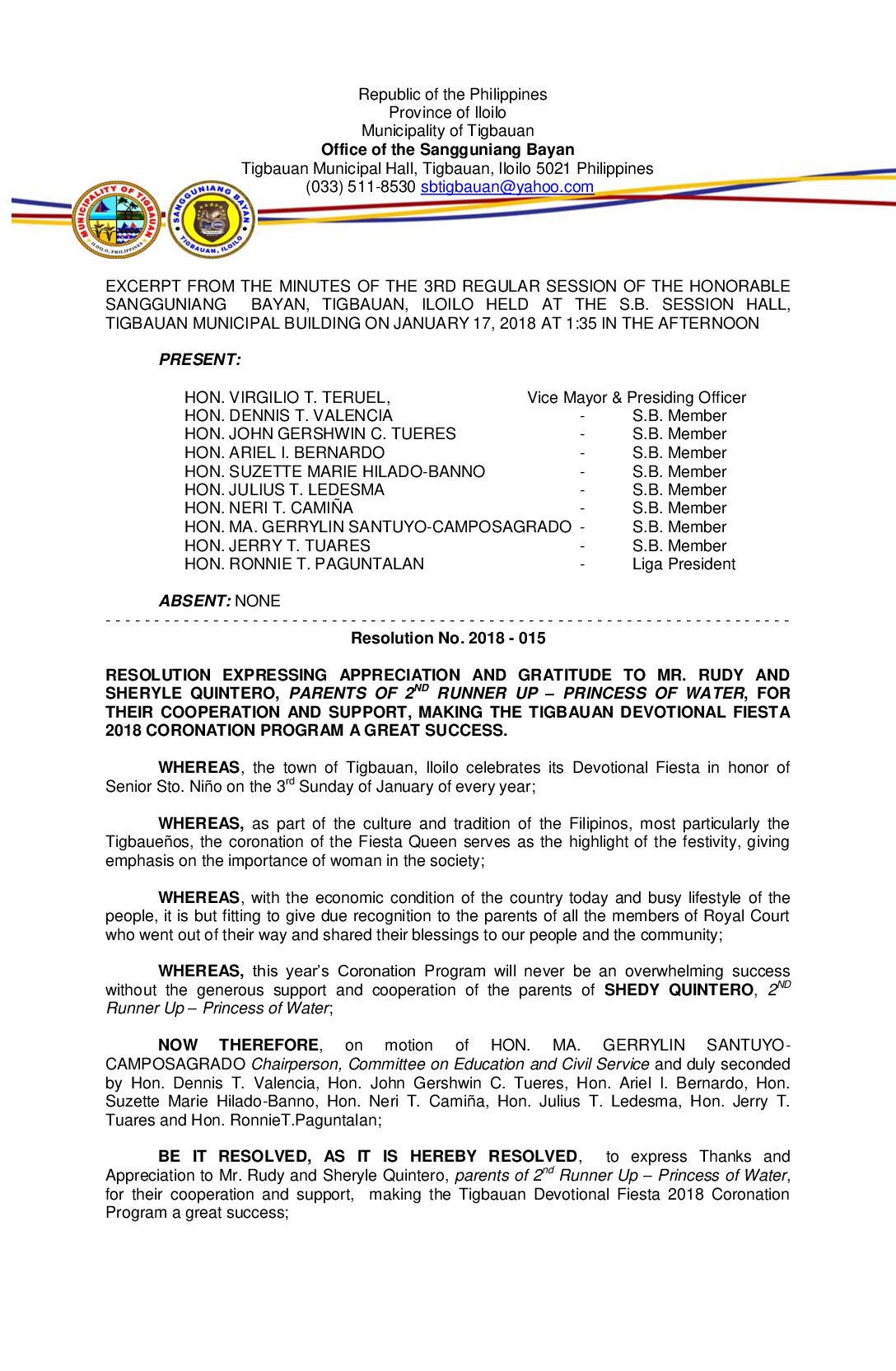 Resolution No. 2018-015 – RESOLUTION EXPRESSING APPRECIATION AND GRATITUDE TO MR. RUDY AND SHERYLE QUINTERO, PARENTS OF 2ND RUNNER UP – PRINCESS OF WATER, FOR THEIR COOPERATION AND SUPPORT, MAKING THE TIGBAUAN DEVOTIONAL FIESTA 2018 CORONATION PROGRAM A GREAT SUCCESS.
