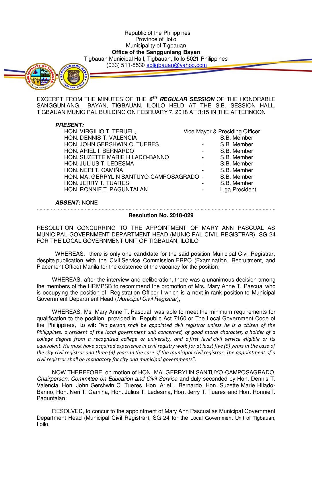 Resolution No. 2018-029 – RESOLUTION CONCURRING TO THE APPOINTMENT OF MARY ANN PASCUAL AS MUNICIPAL GOVERNMENT DEPARTMENT HEAD (MUNICIPAL CIVIL REGISTRAR), SG-24 FOR THE LOCAL GOVERNMENT UNIT OF TIGBAUAN, ILOILO