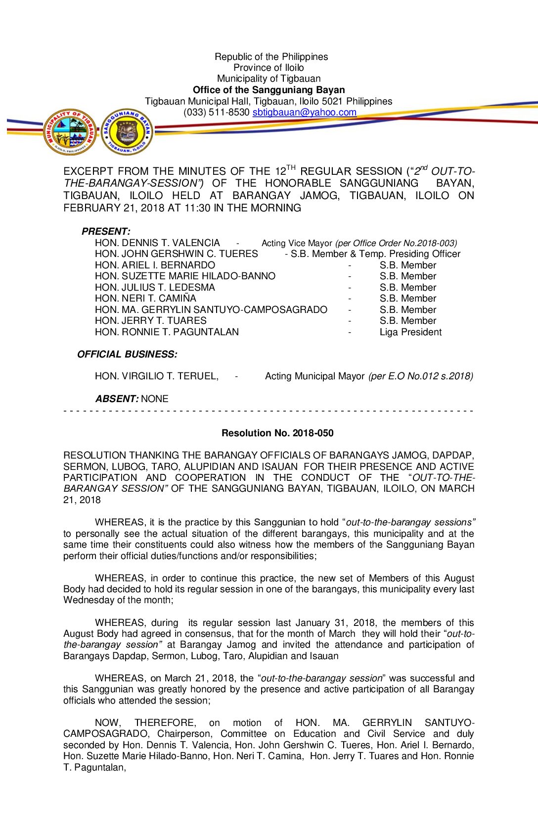 Resolution No. 2018-050 – RESOLUTION THANKING THE BARANGAY OFFICIALS OF BARANGAYS JAMOG, DAPDAP, SERMON, LUBOG, TARO, ALUPIDIAN AND ISAUAN FOR THEIR PRESENCE AND ACTIVE PARTICIPATION AND COOPERATION IN THE CONDUCT OF THE “OUT-TO-THE- BARANGAY SESSION” OF THE SANGGUNIANG BAYAN, TIGBAUAN, ILOILO, ON MARCH 21, 2018