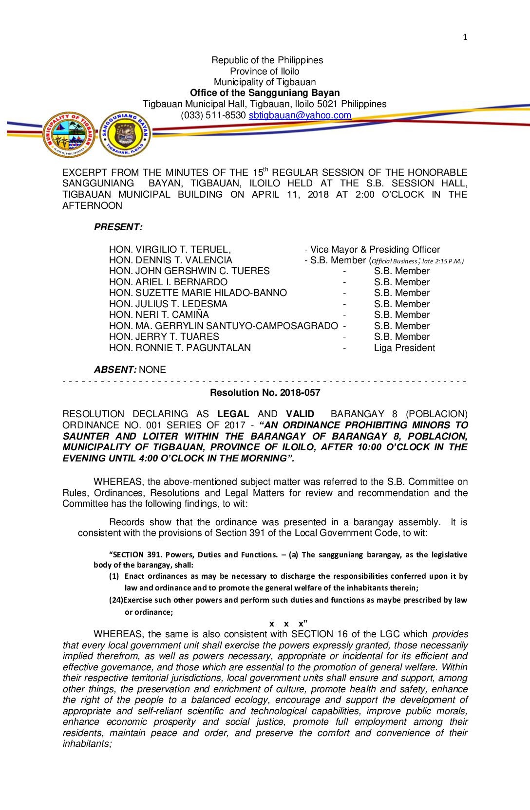 Resolution No. 2018-057 – RESOLUTION DECLARING AS LEGAL AND VALID BARANGAY 8 (POBLACION) ORDINANCE NO. 001 SERIES OF 2017 – “AN ORDINANCE PROHIBITING MINORS TO SAUNTER AND LOITER WITHIN THE BARANGAY OF BARANGAY 8, POBLACION, MUNICIPALITY OF TIGBAUAN, PROVINCE OF ILOILO, AFTER 10:00 O’CLOCK IN THE EVENING UNTIL 4:00 O’CLOCK IN THE MORNING”.