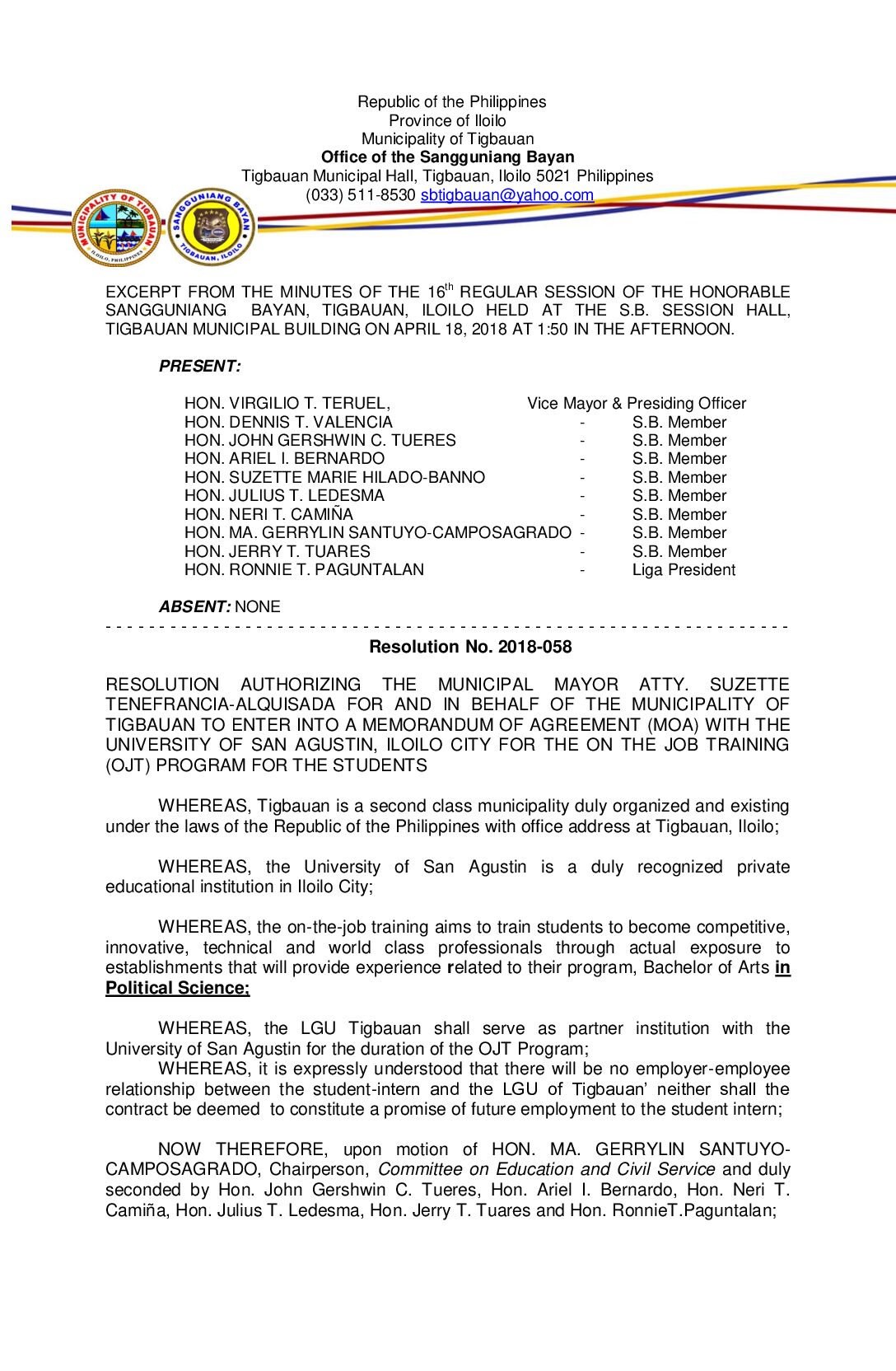 Resolution No. 2018-058 – RESOLUTION AUTHORIZING THE MUNICIPAL MAYOR ATTY. SUZETTE TENEFRANCIA-ALQUISADA FOR AND IN BEHALF OF THE MUNICIPALITY OF TIGBAUAN TO ENTER INTO A MEMORANDUM OF AGREEMENT (MOA) WITH THE UNIVERSITY OF SAN AGUSTIN, ILOILO CITY FOR THE ON THE JOB TRAINING (OJT) PROGRAM FOR THE STUDENTS
