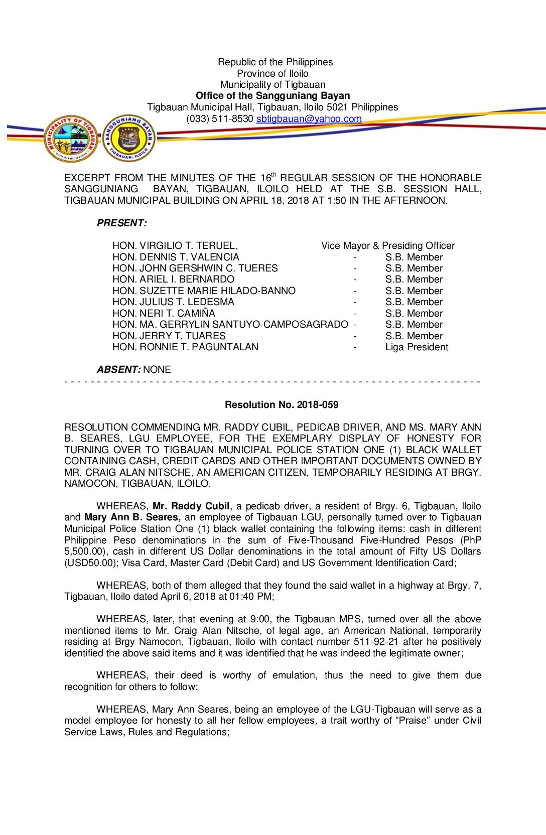 Resolution No. 2018-059 – RESOLUTION COMMENDING MR. RADDY CUBIL, PEDICAB DRIVER, AND MS. MARY ANN B. SEARES, LGU EMPLOYEE, FOR THE EXEMPLARY DISPLAY OF HONESTY FOR TURNING OVER TO TIGBAUAN MUNICIPAL POLICE STATION ONE (1) BLACK WALLET CONTAINING CASH, CREDIT CARDS AND OTHER IMPORTANT DOCUMENTS OWNED BY MR. CRAIG ALAN NITSCHE, AN AMERICAN CITIZEN, TEMPORARILY RESIDING AT BRGY. NAMOCON, TIGBAUAN, ILOILO.